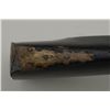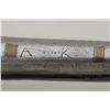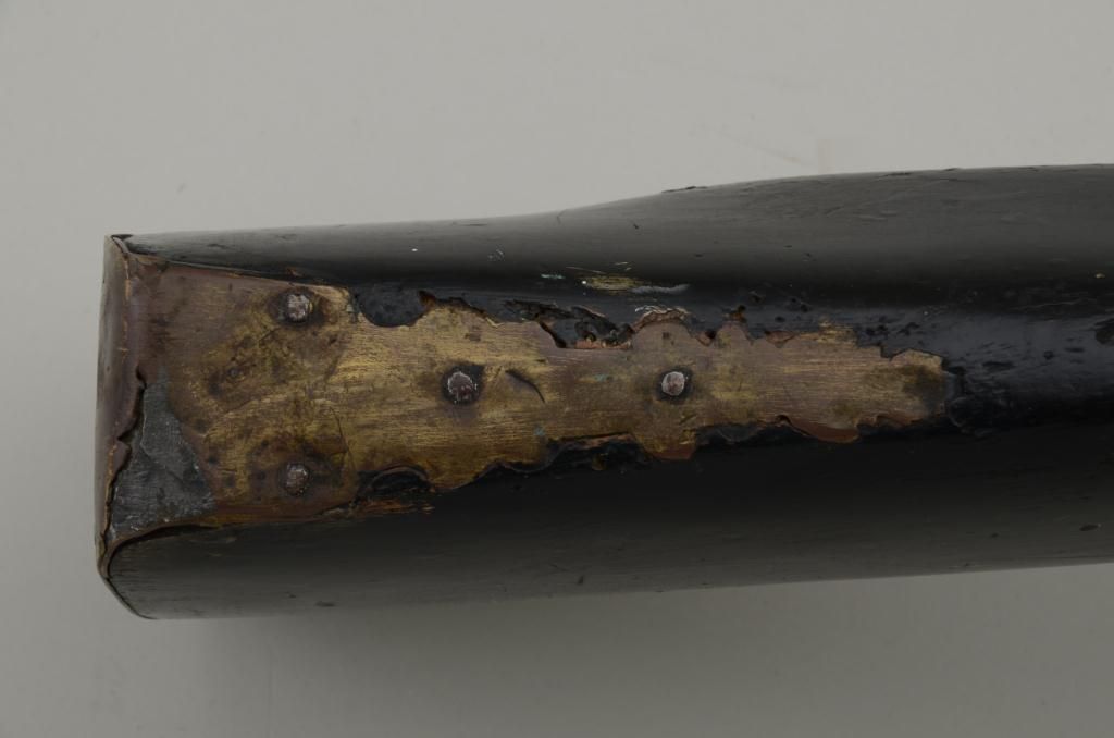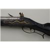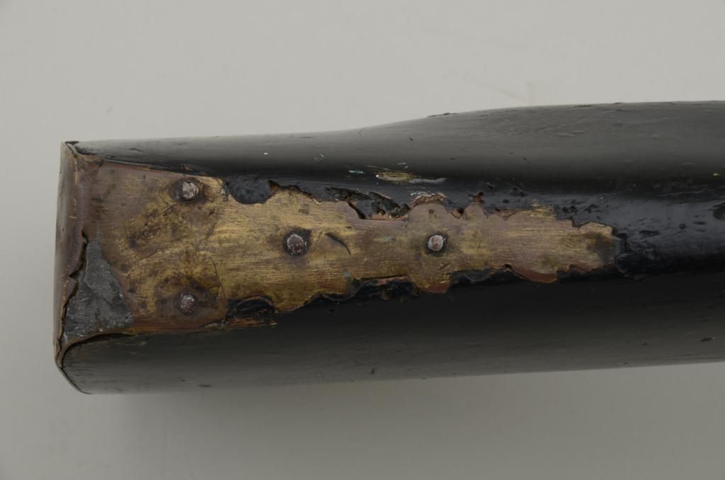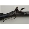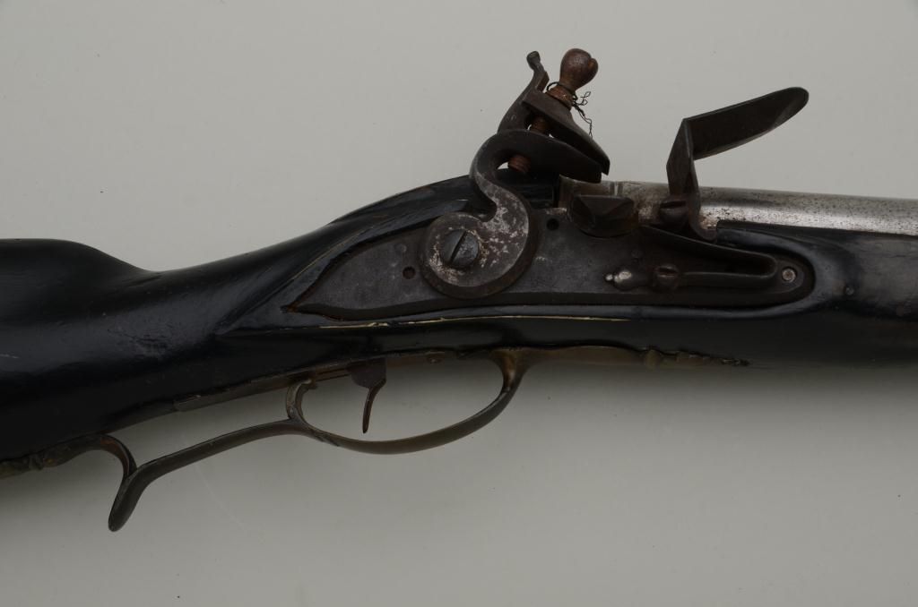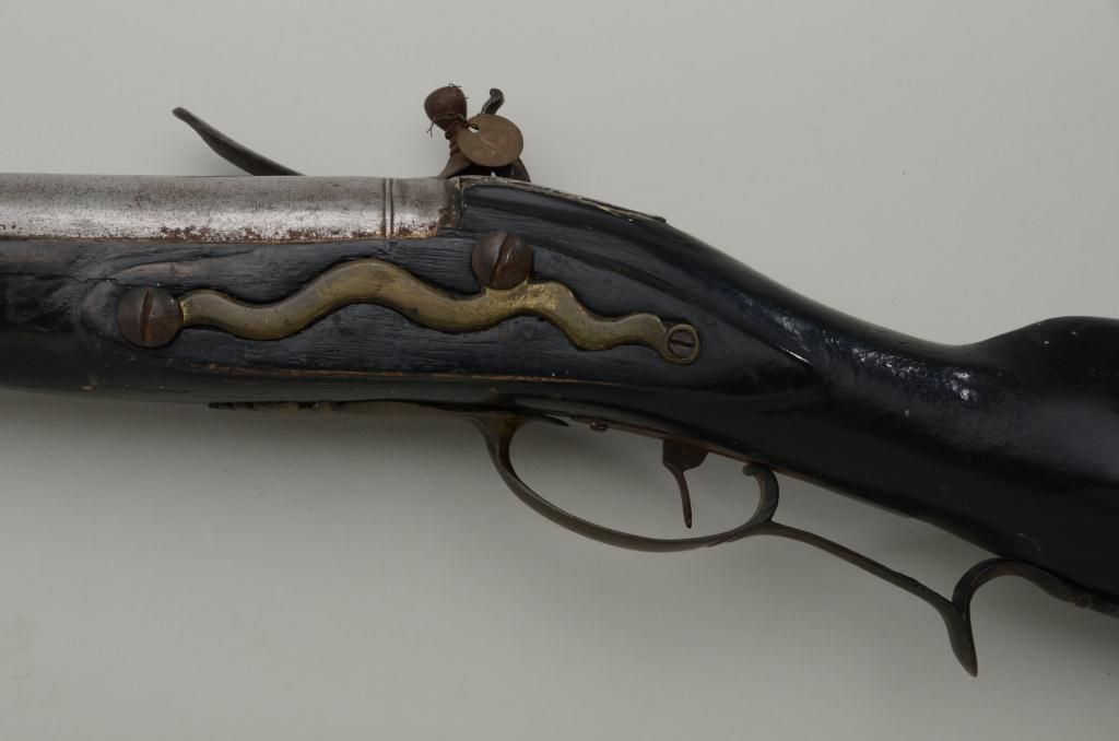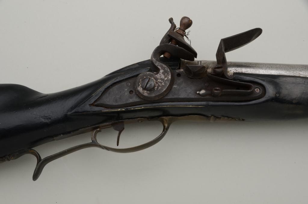 Colonial era flintlock fowler showing strong Germanic influence and styling signed A.K. and dated 1718 on the barrel. The gun measures 77 ½” overall with 61 ½” round barrel of approximately .80 calibersmoothbore. The lock is in its original flintlock configuration showing a dark brown patina with original hammer, frizzen, top jaw , screws and small parts. There is a collection tag numbered 1402 wired to thescrew. The barrel shows two brass inlays where there had been a sight on the barrel which was moved back or taken off. The side plate shows a serpentine influenced shape and the trigger guard shows simple treetop style finial. The butt plate is thin brass nailed on. The butt measures 2 ¾” in width with thick and heavy Germanic style. The stock has had extensive restoration and has been darkened to black finish at the point ofrestoration to mask the repairs which were done long ago. The forend cap is an old incorrect replacement using cow bone. The ramrod thimbles and mounts show a dark patina. This Fowler may well have been