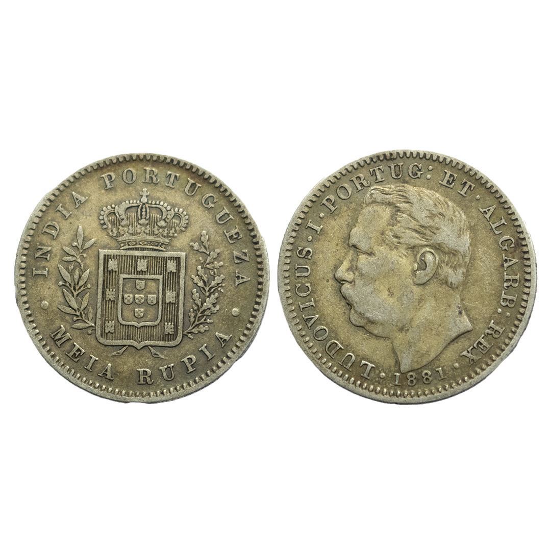 Colonial issue, Ruler Luiz I / Ludwig(c. 1861-1889 AD), Silver ½ Rupia, 5.73Grms, AD 1881, Obv: Bust of Luiz I facing to left, Rev: Crowned arms with sprays. (KM # 311).