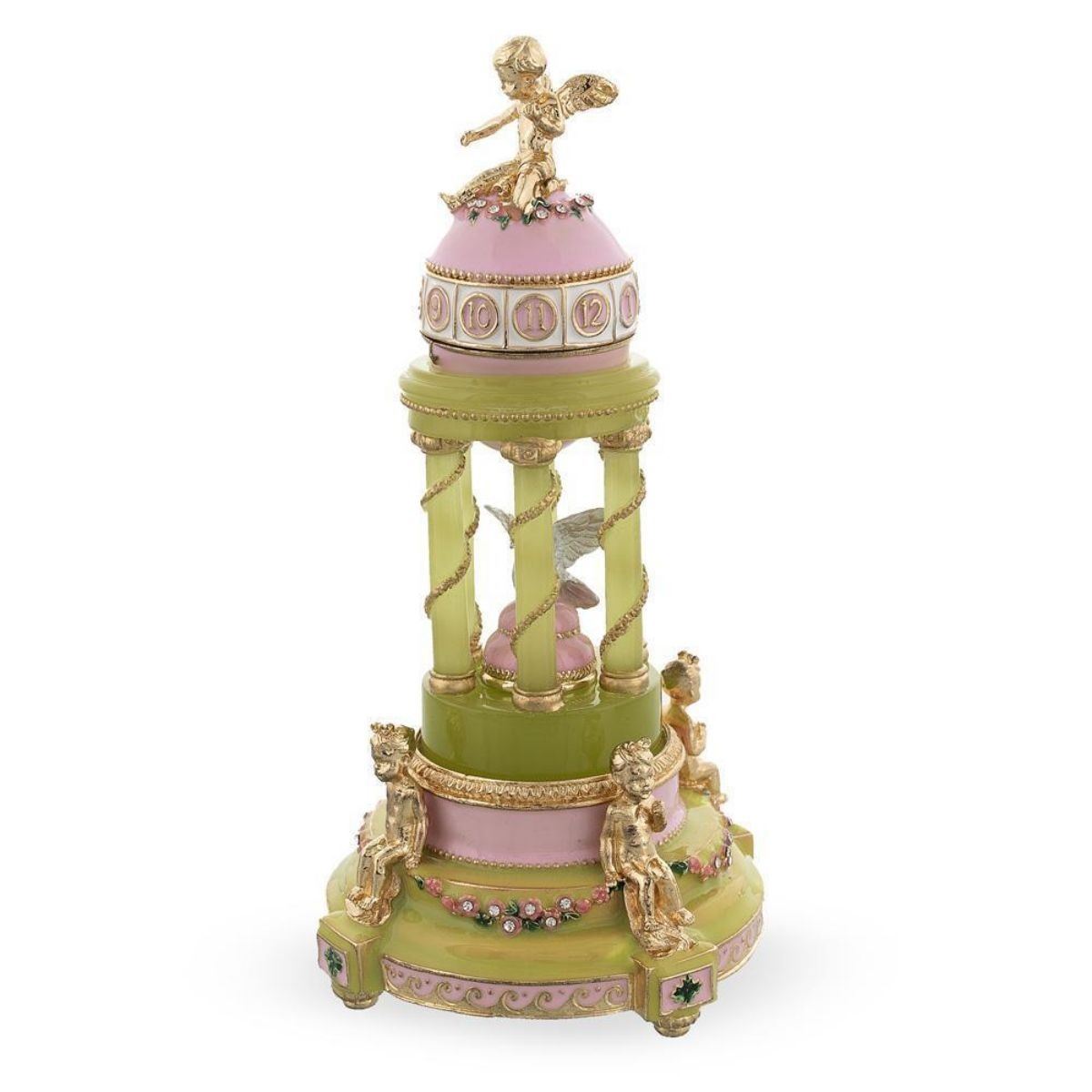 After the original 1910 Colonnade Royal egg, designed by Carl Faberge for The Russian Royal Family. Enamel & gilt over pewter, with embedded Austrian crystals. The magnificent egg lifts away from its stand & opens at center on a hinge, closes shut with a magnet, to reveal an enameled interior for storing trinkets or jewels. The base of the stand in a music box that plays "For Elise" by Beethoven Comes in a beautiful gift box. 6 1/2" H X 3 1/2" W. The egg opens on a hinge and closes shut with a magnet Comes in a beautiful gift box. Â