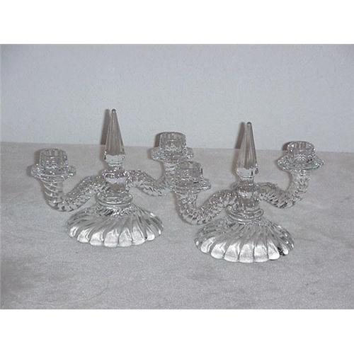 A pair of 6 1/2" double candleholders in the "Colony" pattern made by Fostoria glass co. made between the 1930's and 1983. A very pretty pair of glass holders for the collector or just to grace your table. The condition is very good, no chips or cracks, the pair measures 8 1/4" long with a 4 1/4" diameter base.(3+)