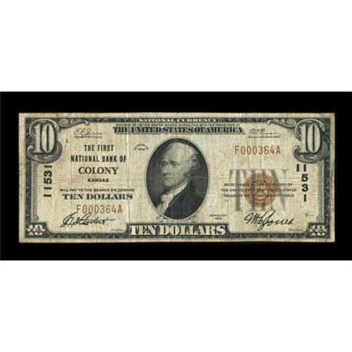 <B>Colony, KS</B></I> - $10 1929 Ty. 1 <B>The First NB</B></I> Ch. # 11531<BR> This is one of a mere four small size notes in the census for the sole issuer in this Anderson County hamlet. In fact a Series 1929 note on this charter number has never crossed the auction block at a traditional "bricks and mortar" auction house. <B>Very Good+++.</B></I><BR><I>From The J.S. Weber Collection.</B></I><BR><BR><b>Shipping:</b> Coins & Currency (<a target="_blank" href="http://www.heritageauctions.com/common/shipping.php">view shipping information</a>)
