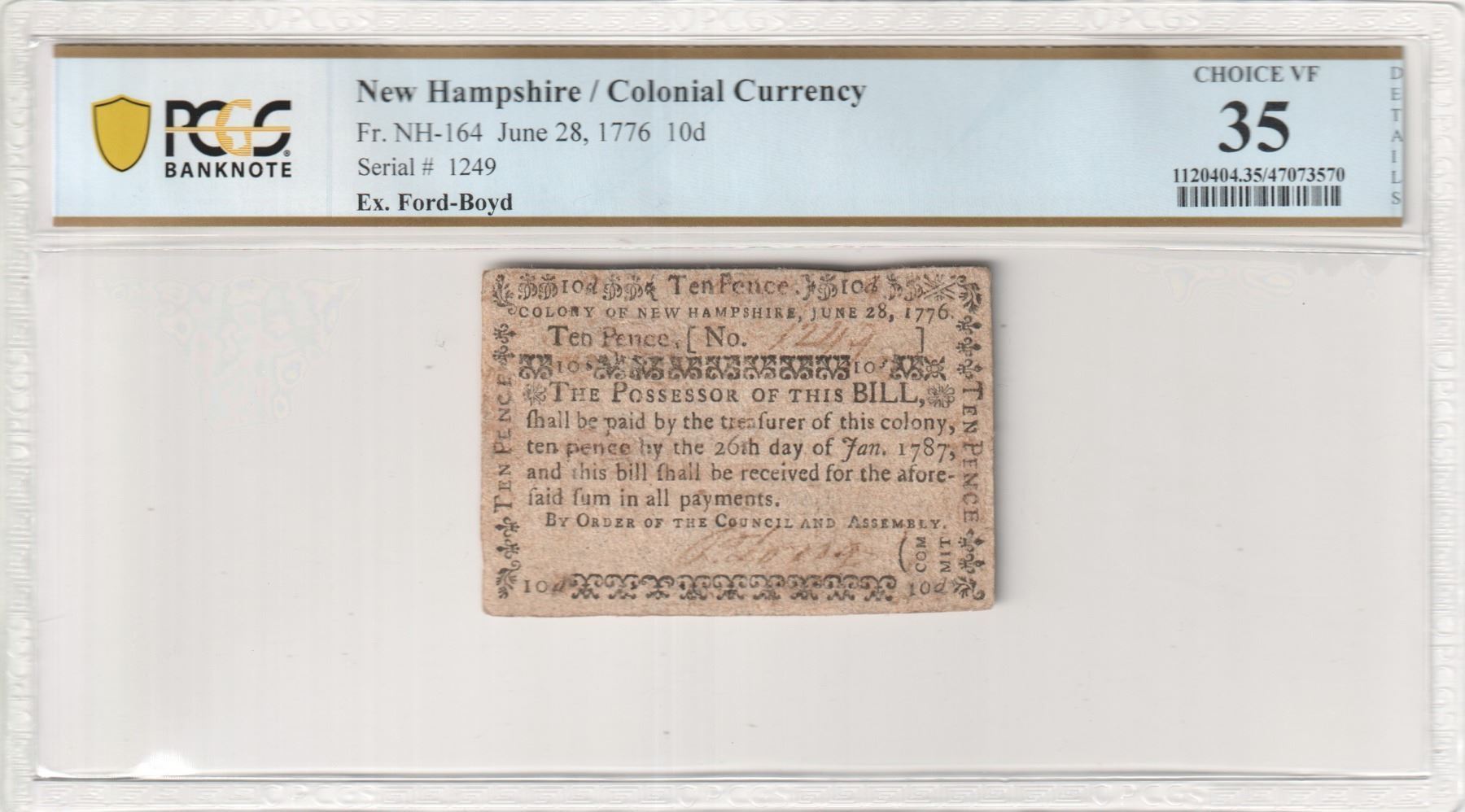 Colony of New Hampshire. June 28, 1776. Redated June 1, 1756. Ten Pence. Fr. NH-164. PCGS Choice Very Fine-35 Details. Multiple Repairs, Design Redrawn, Contemporary Annotation. As illustrated.