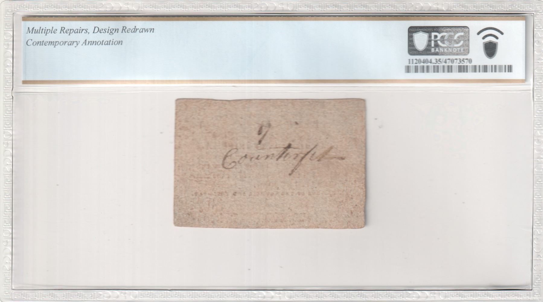 Description: Thick, coarse stock. Serial No. 1249. Signed by Long. 72mm by 57mm. Uniface. Only six more days after issue until the Revolution begins! Evenly centered with bold inking and a good overall aesthetic appearance. Old mounting hinge residue shown in the Ford catalog has been curated away, but not to the detriment of the visuals. Intriguing “7/Counterfeit” in cursive period hand on verso, its meaning lost to memory long ago. Not a great rarity, as are so many of the other notes in this sale, but still a note that will be pursued vigorously for its provenance, appearance, and its history.