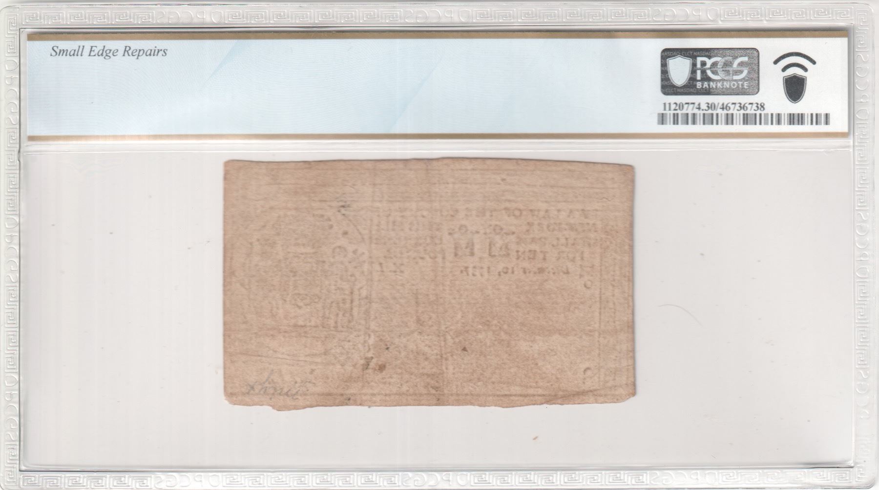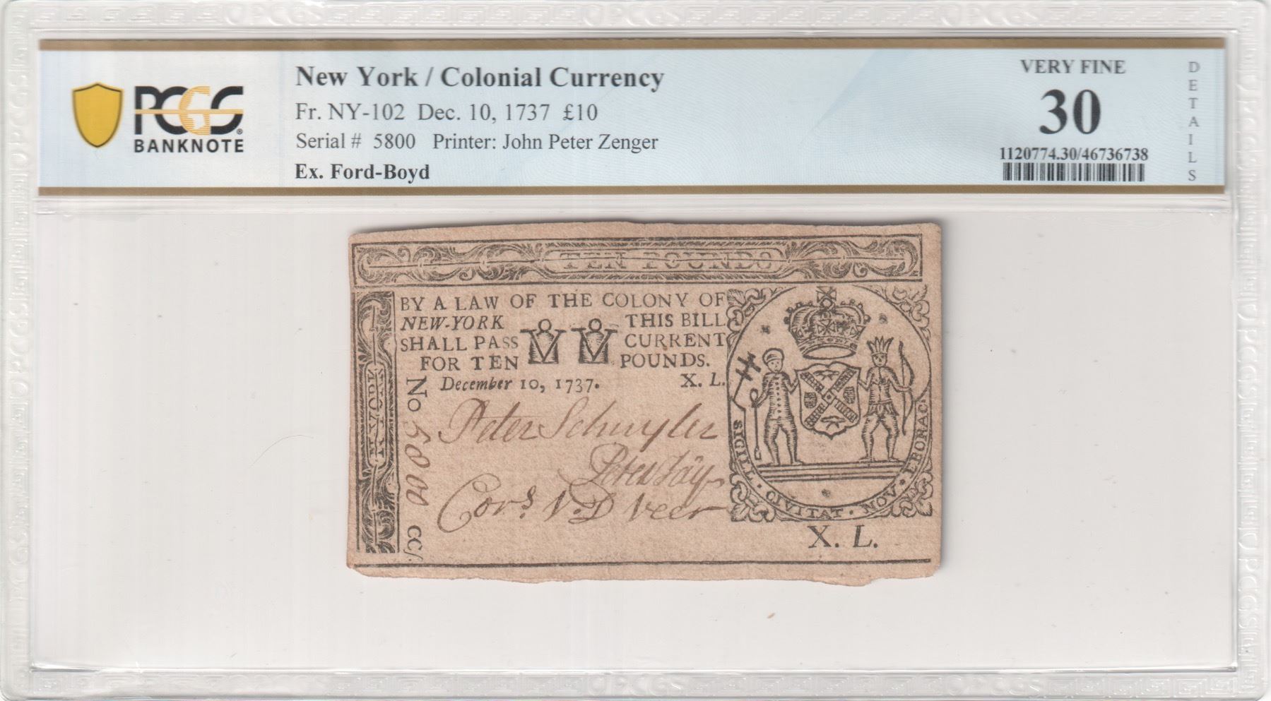 Colony of New-York. December 10, 1737. Ten Pounds. Fr. NY-102. PCGS Very Fine-30 Details. Small Edge Repairs. As illustrated.