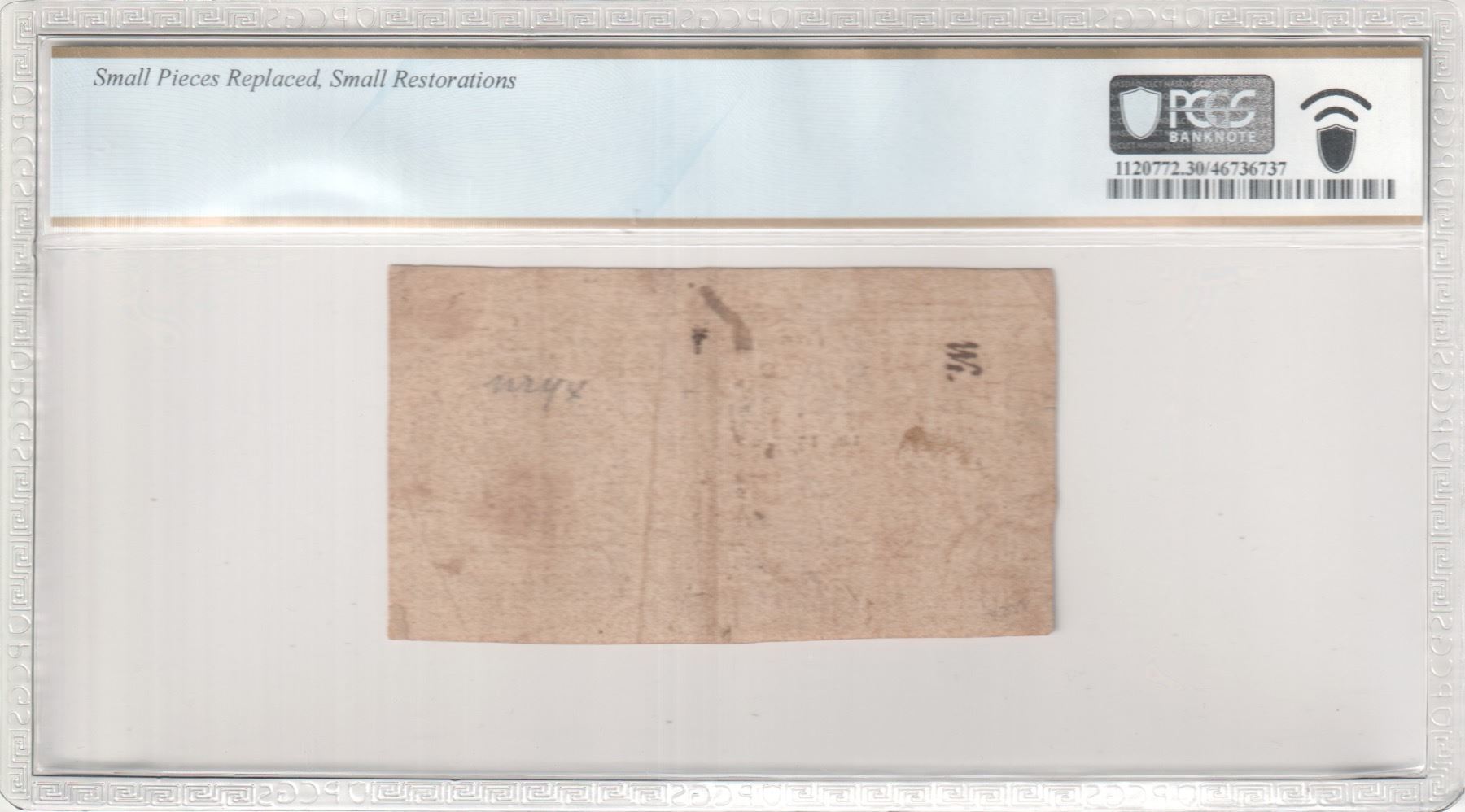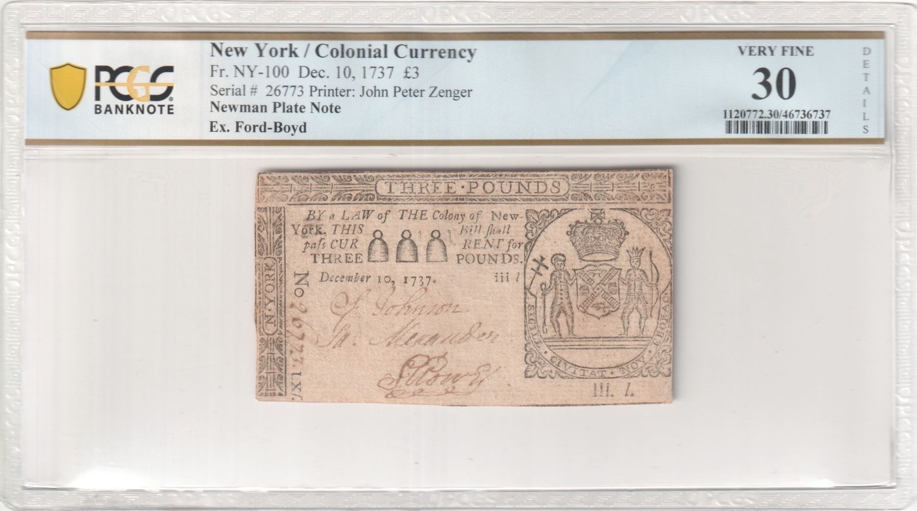 Description: Laid paper. Serial No. 26773. Signed by S. Johnson, James Alexander, and S. Rowe. Uniface. Printed by John Peter Zenger, his imprint not present. 100mm by 55mm. The images of three one-pound weights are a part of the face printing, this as an aid to thwart unscrupulous persons from “raising” the denomination. This December 10, 1737 New-York series of notes is the only series printed by John Peter Zenger, whose acquittal in an important libel case helped to establish freedom of the press in America. Choice for the grade in appearance and overall quality, margins a trifle tight but full design present, penciled notation on verso.