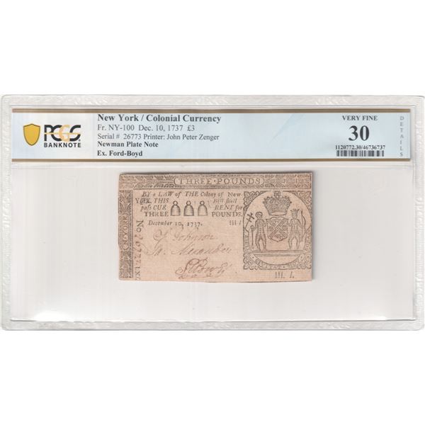Colony of New-York. December 10, 1737. Three Pounds. Fr. NY-100. PCGS Very Fine-30 Details. Small Pi