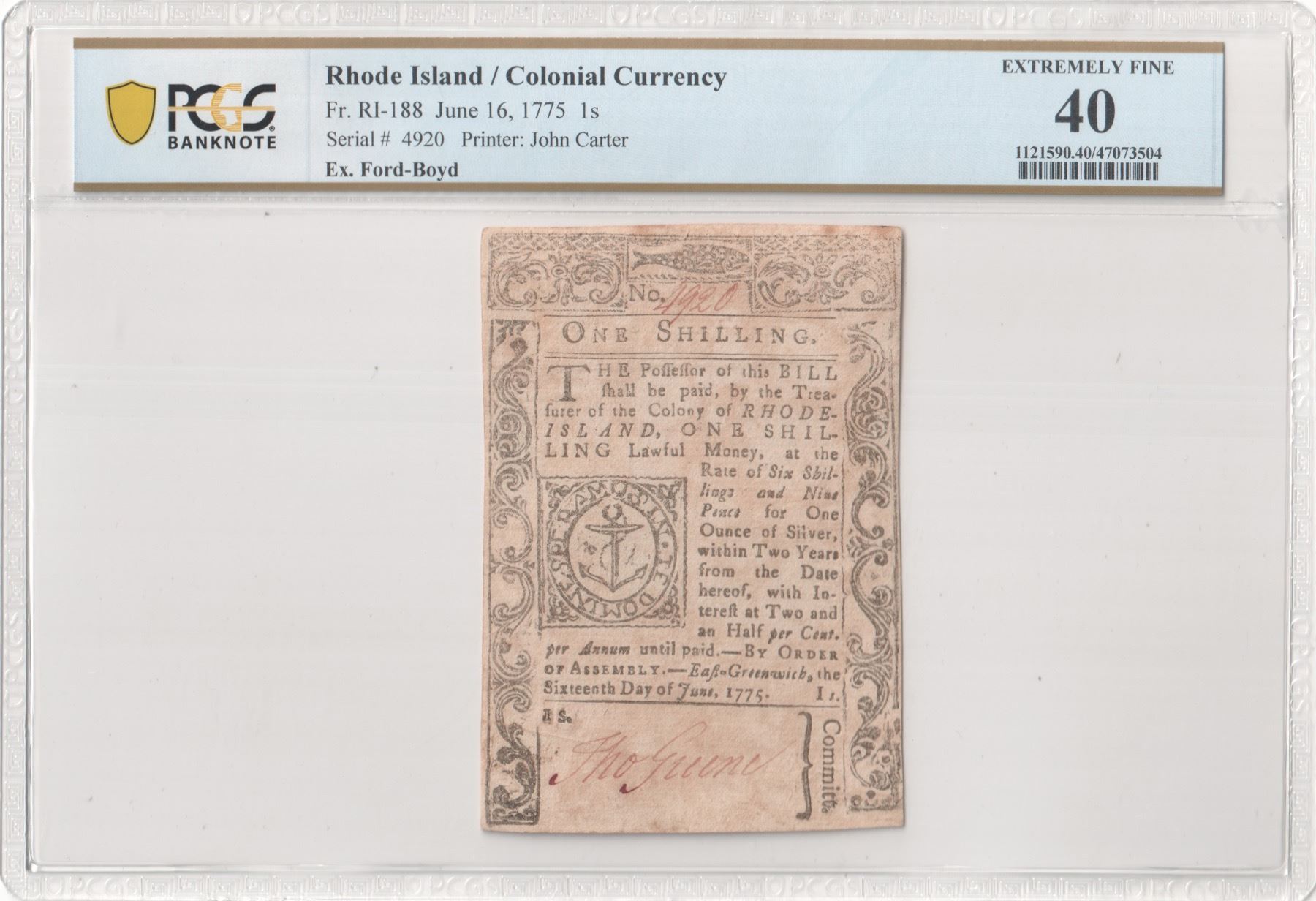 Colony of Rhode Island. East-Greenwich. June 16, 1775. One Shilling. Fr. RI-188. PCGS Extremely Fine-40. No qualifiers. As illustrated.