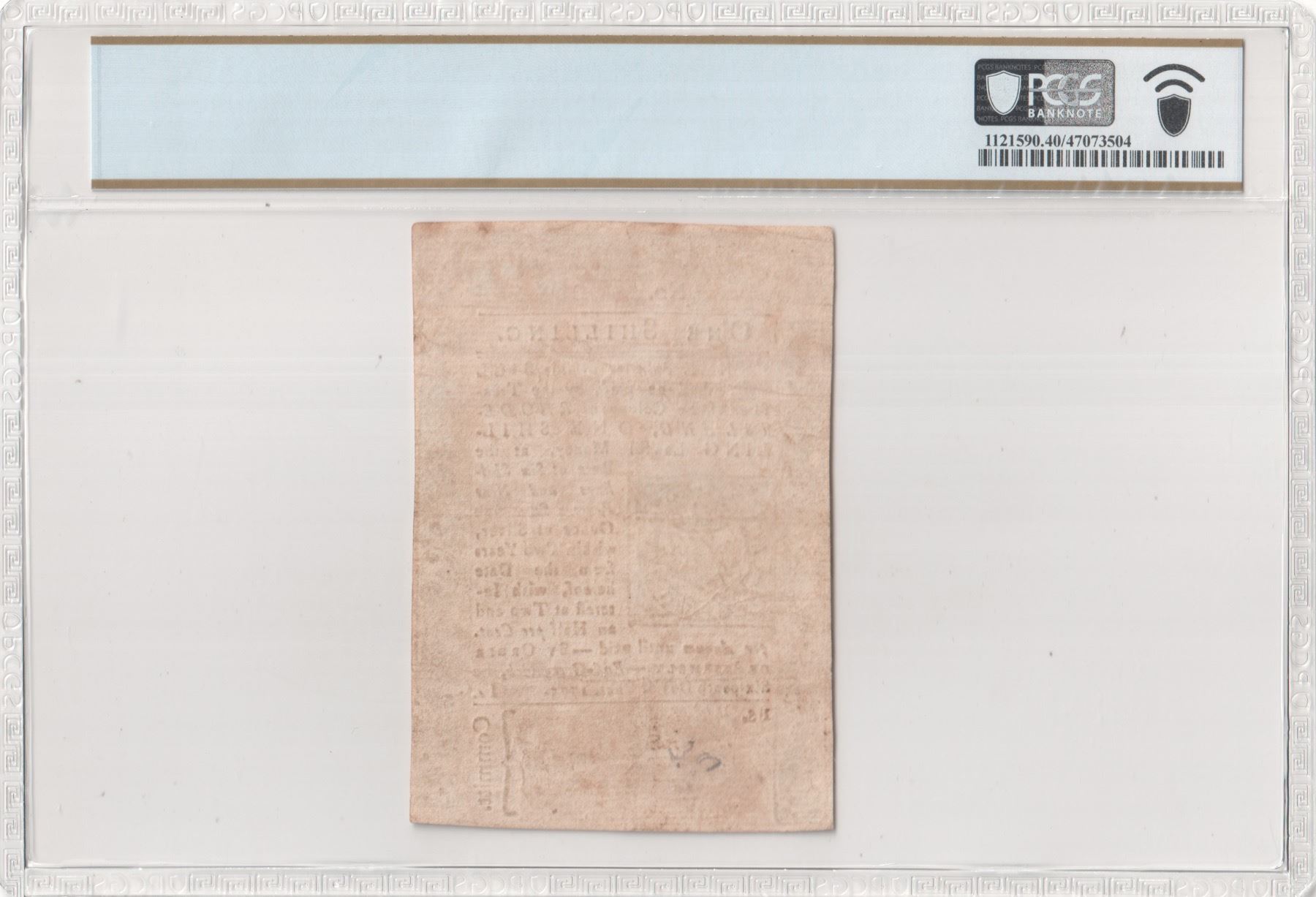 Description: Laid paper. Serial No. 4920. Signed by Tho. Greene. Printed by John Carter. Uniface. 70mm by 100mm. “The one shilling note would have been a real workhorse in circulation and a high-grade example has to be considered an exceptional condition rarity,” wrote the Ford cataloger, and precious little has changed since those words were written 17 years ago. A beautiful note, evenly margined with only modest fading to the inked imprint and red signature and serial number. Choice throughout.