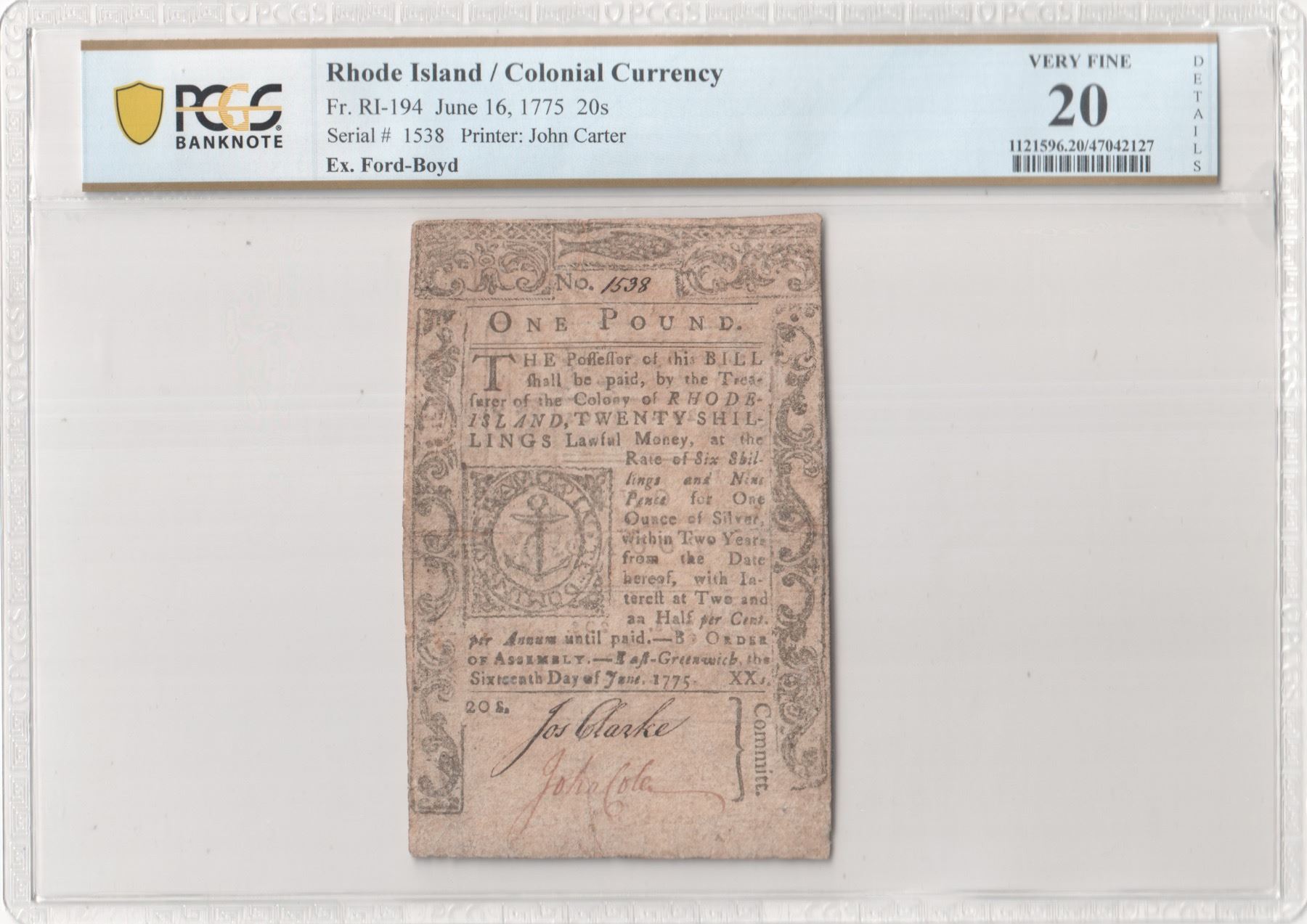 Colony of Rhode Island. East-Greenwich. June 16, 1775. Twenty Shillings or One Pound. Fr. RI-194. PCGS Very Fine-20 Details. Multiple Repairs. As illustrated.