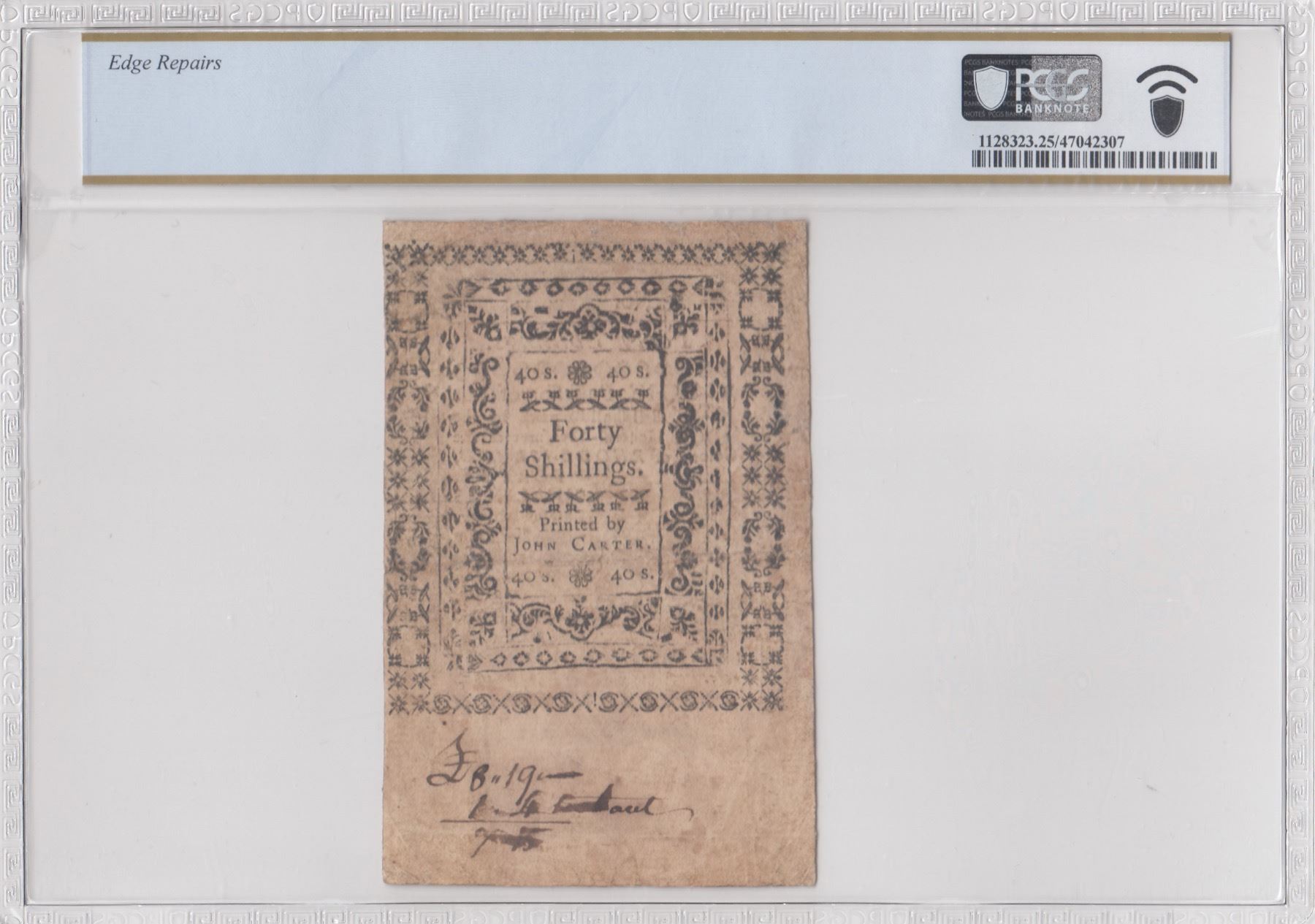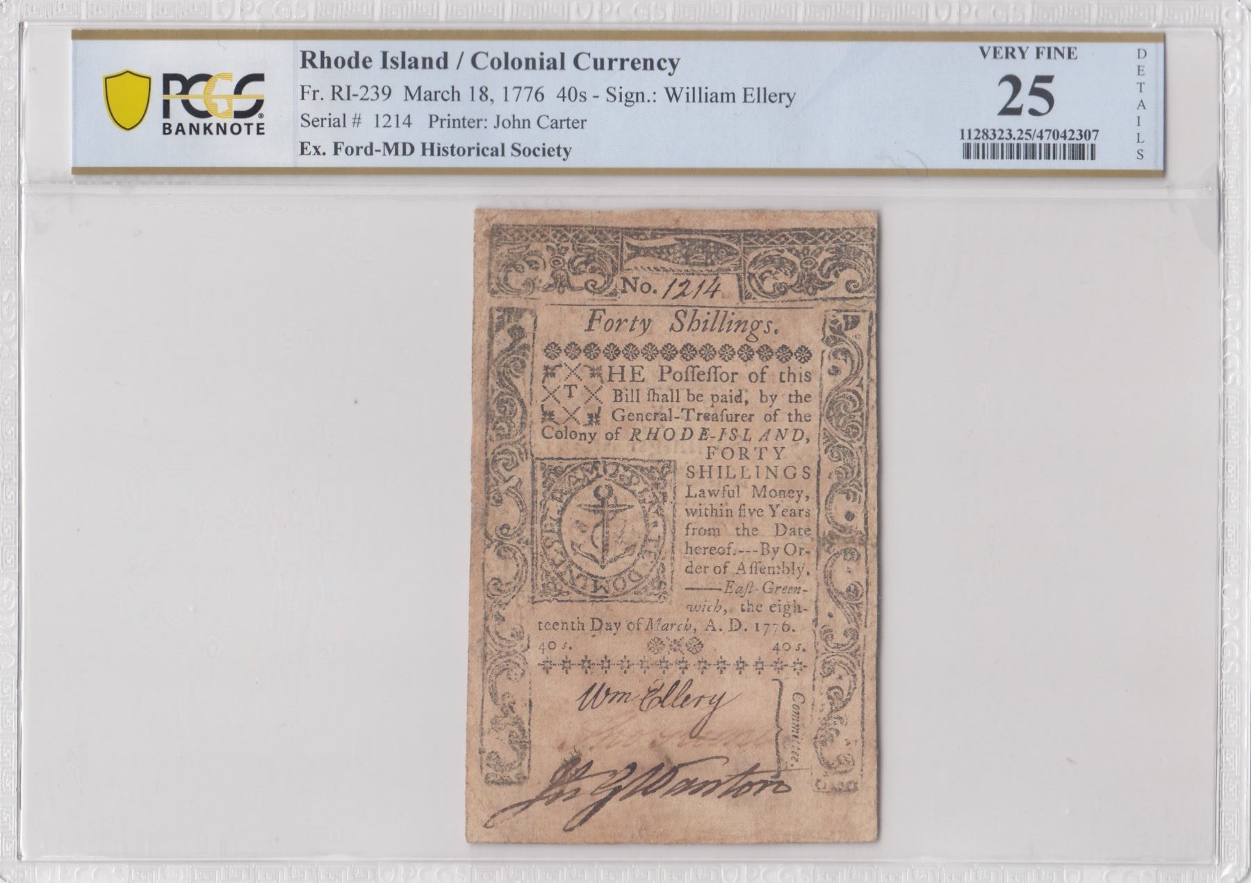 Colony of Rhode Island. East-Greenwich. March 18, 1776. Forty Shillings. Fr. RI-239. PCGS Very Fine-25 Details. Edge Repairs. As illustrated.