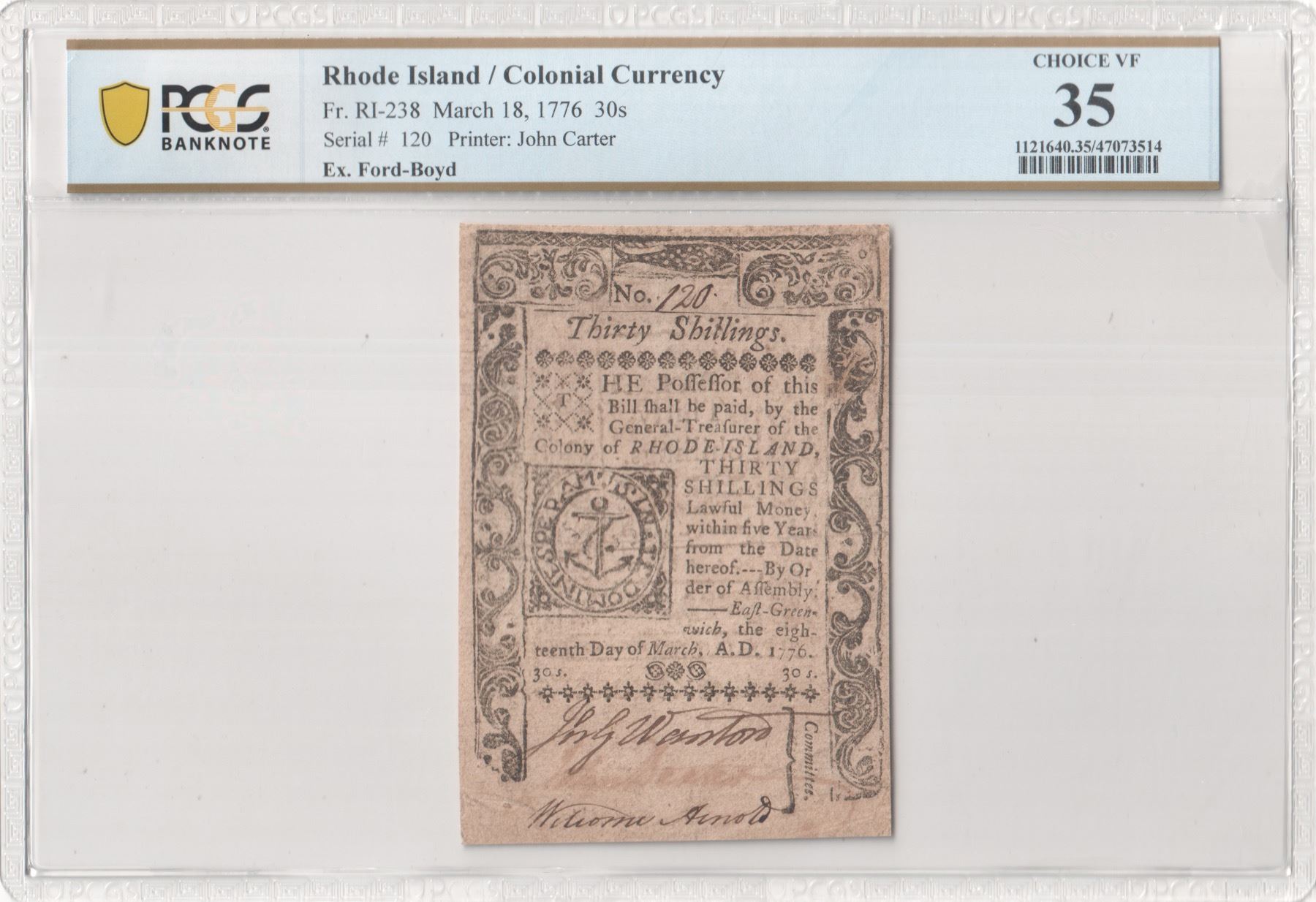 Colony of Rhode Island. East-Greenwich. March 18, 1776. Thirty Shillings. Fr. RI-238. PCGS Choice Very Fine-35. No qualifiers. As illustrated.