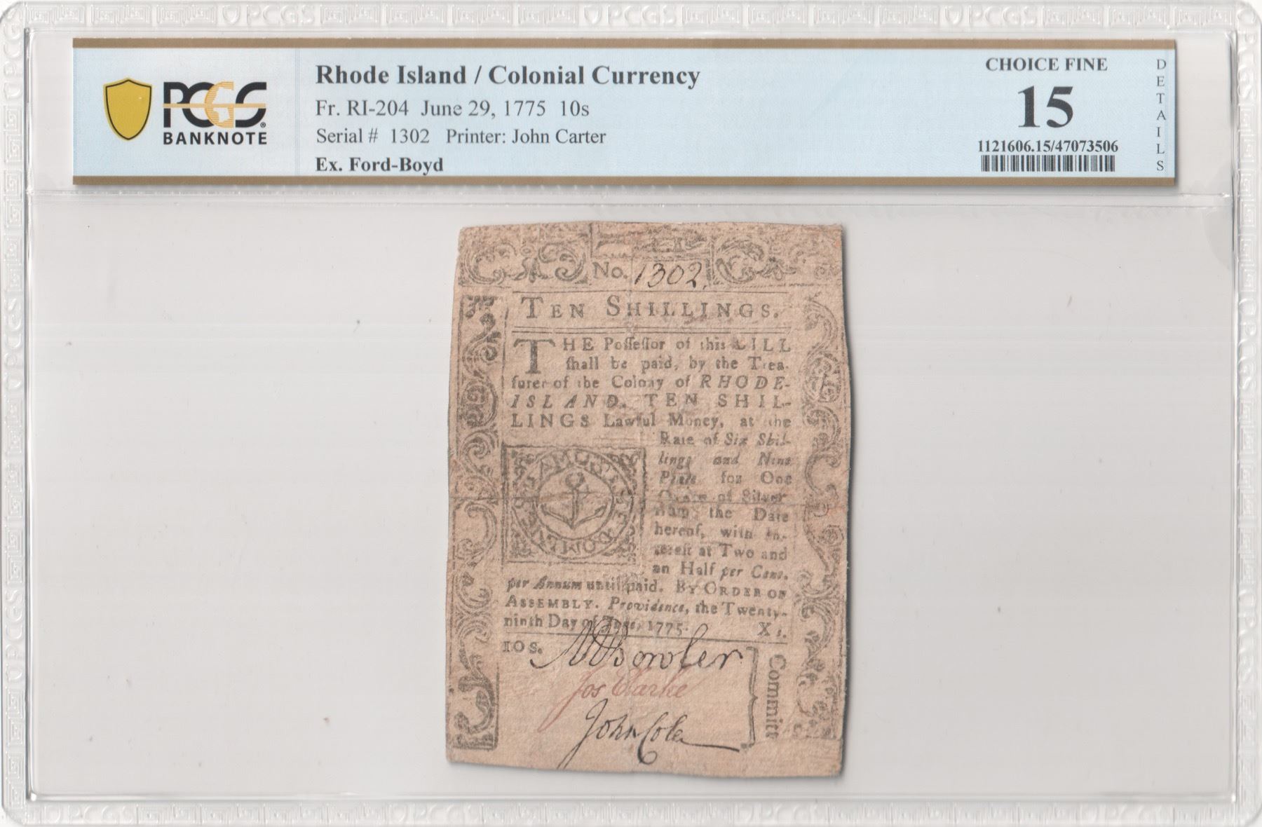 Colony of Rhode Island. Providence. June 29, 1775. Ten Shillings. Fr. RI-204. PCGS Choice Fine-15 Details. Severed and Reattached, Backed. As illustrated.