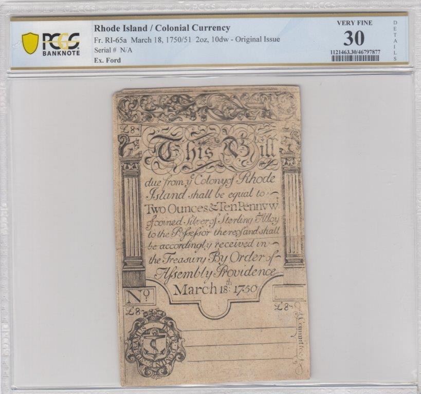Colony of Rhode Island. Providence. March 18, 1750/51. Two Ounces & Ten Pennyweight. Fr. RI-65a. PCGS Very Fine-30 Details. Repaired Edge Splits, Minor Edge Tear. As illustrated.