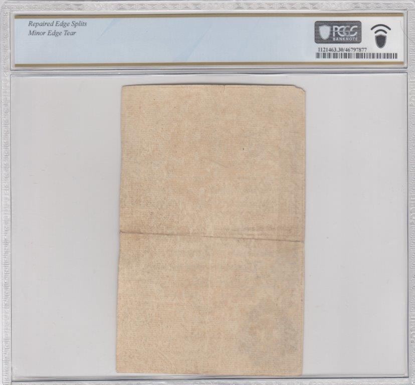 Description: Laid paper, crown circle watermark. No Serial number. No Signatures. Printer uncertain. Uniface. 90mm by 142mm. Called “A Proof or Remainder, from the original plates, of the face only” by the Ford writer. Corner chip upper left face, slight fading of design upper right face, otherwise perfect and with the eye appeal of a finer grade altogether. Another unusual Rhode Island offering for the completist’s contemplation.