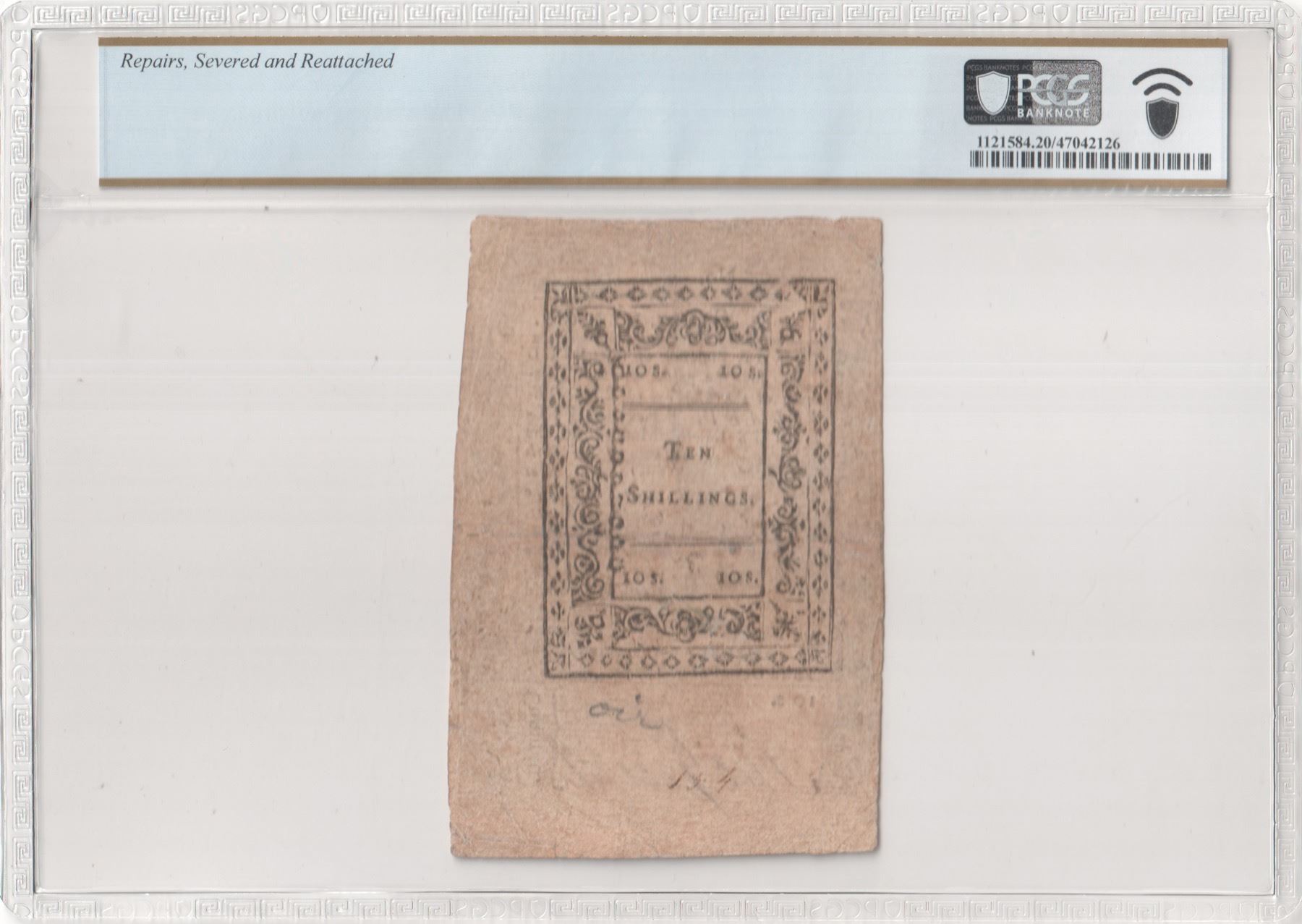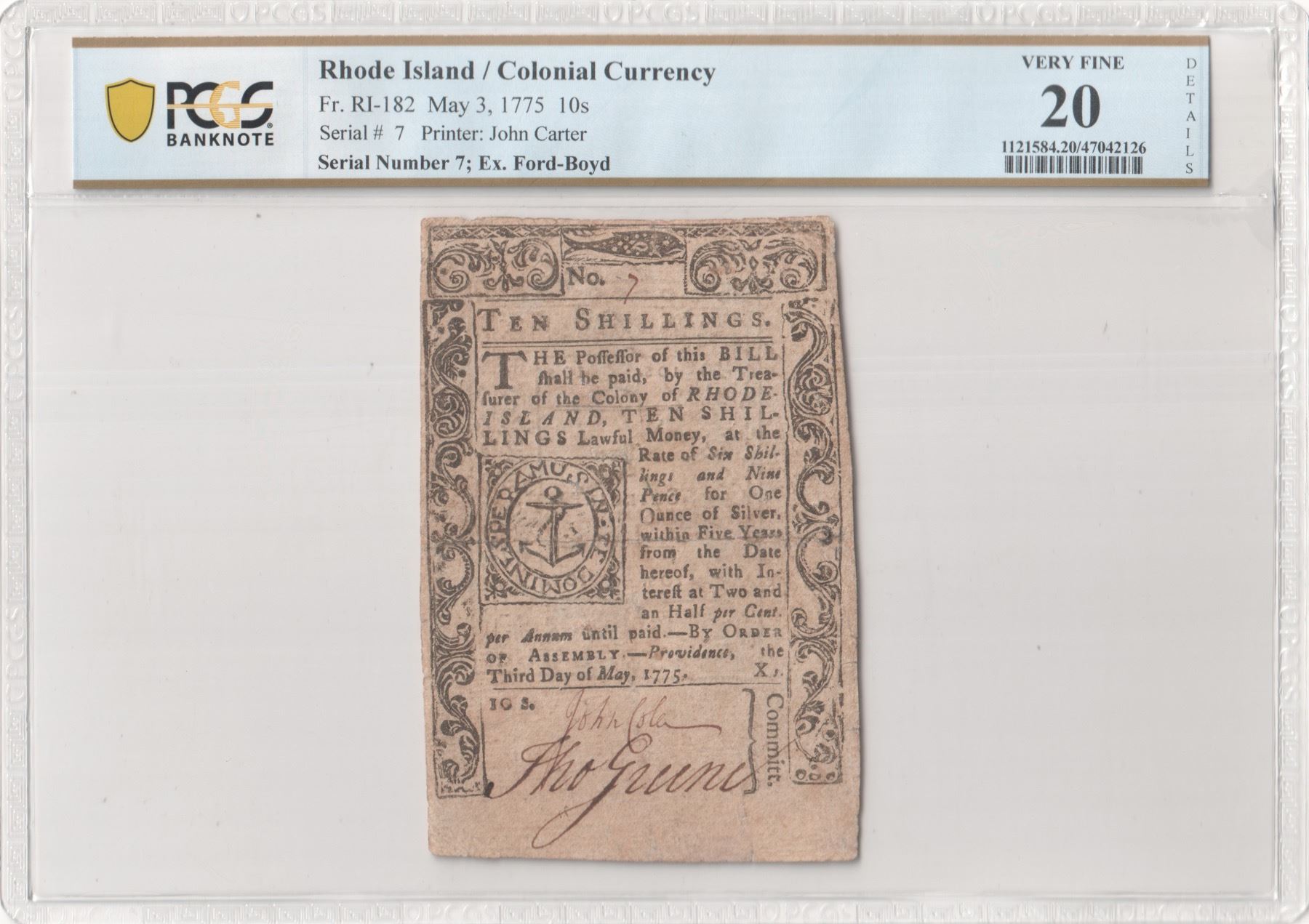 Colony of Rhode Island. Providence. May 3, 1775. Ten Shillings. Fr. RI-182. PCGS Very Fine-20 Details. Repairs, Severed and Reattached. As illustrated.