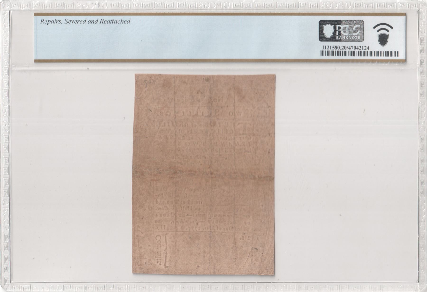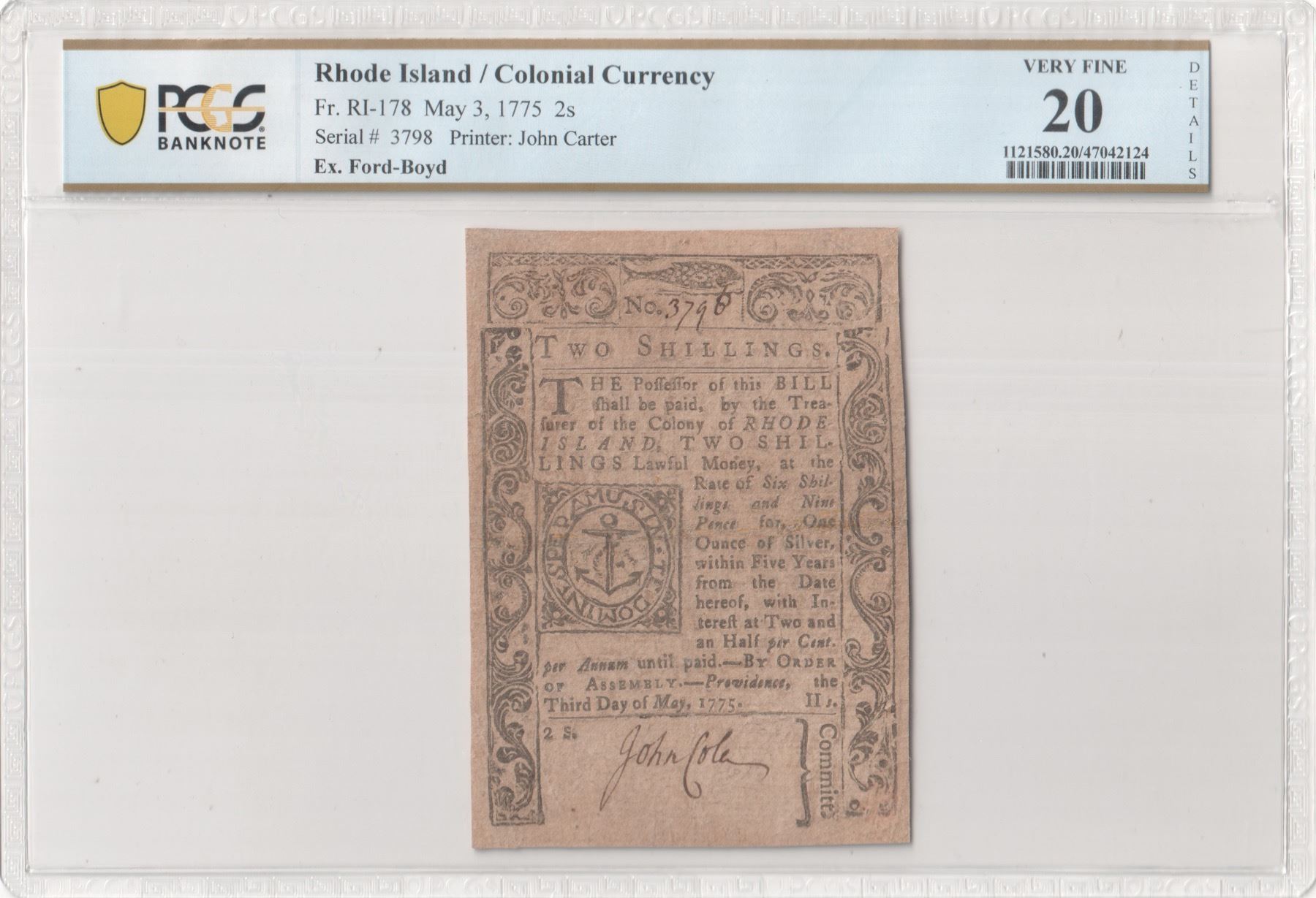 Colony of Rhode Island. Providence. May 3, 1775. Two Shillings. Fr. RI-178. PCGS Very Fine-20 Details. Repairs, Severed and Reattached. As illustrated.