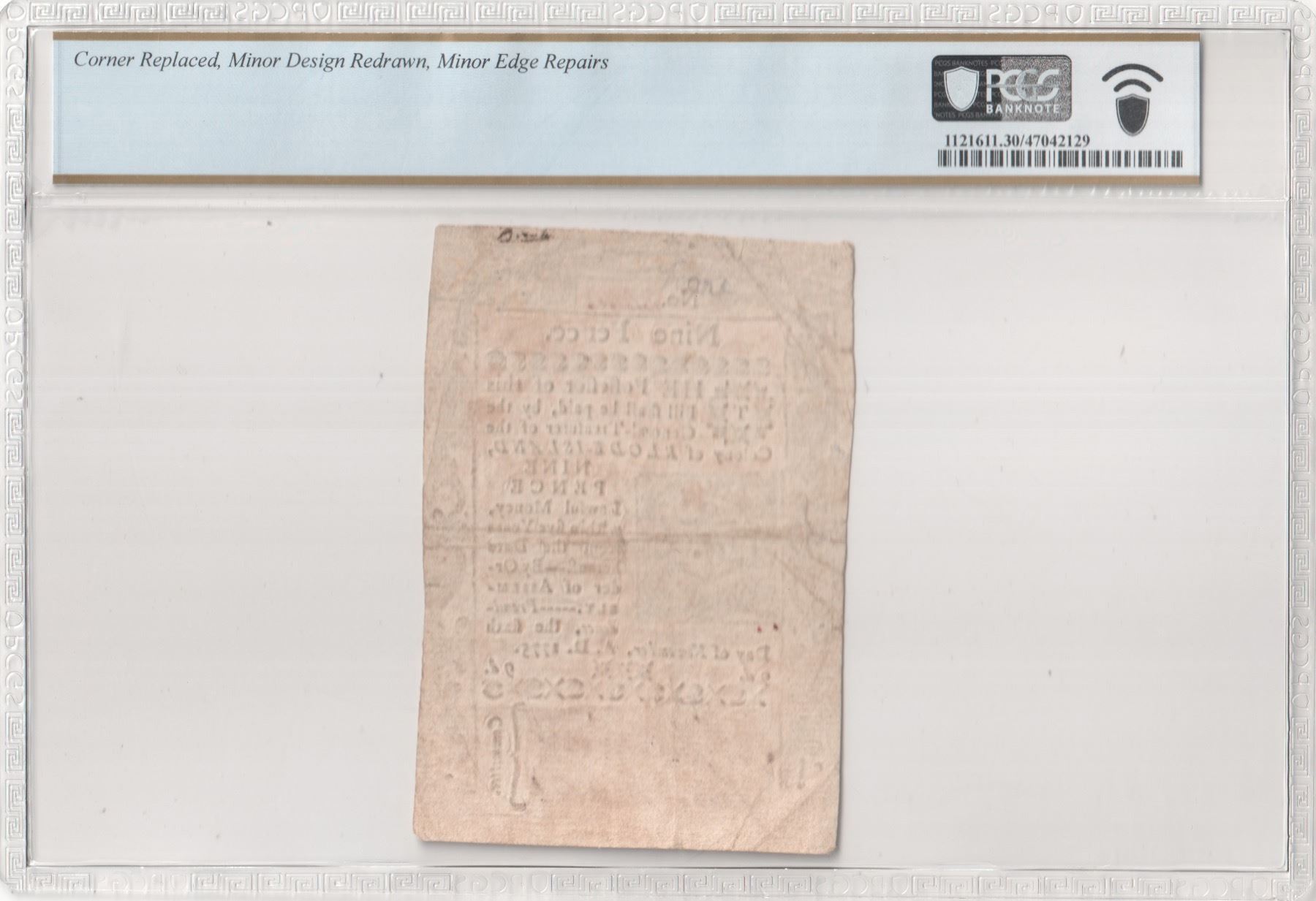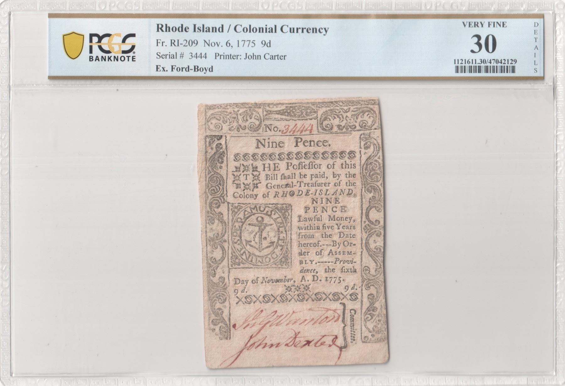 Colony of Rhode Island. Providence. November 6, 1775. Nine Pence. Fr. RI-209. PCGS Very Fine-30 Details. Corner (upper right) Replaced, Minor Design Redrawn, Minor Edge Repairs. As illustrated.