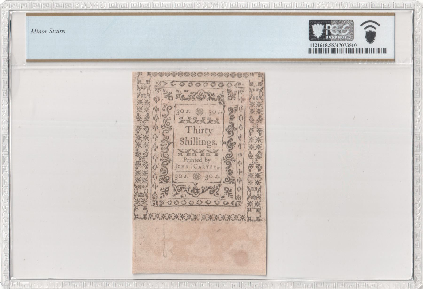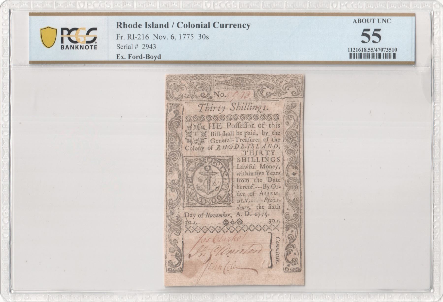 Colony of Rhode Island. Providence. November 6, 1775. Thirty Shillings. Fr. RI-216. PCGS About Uncirculated-55 Details. Minor Stains. As illustrated.