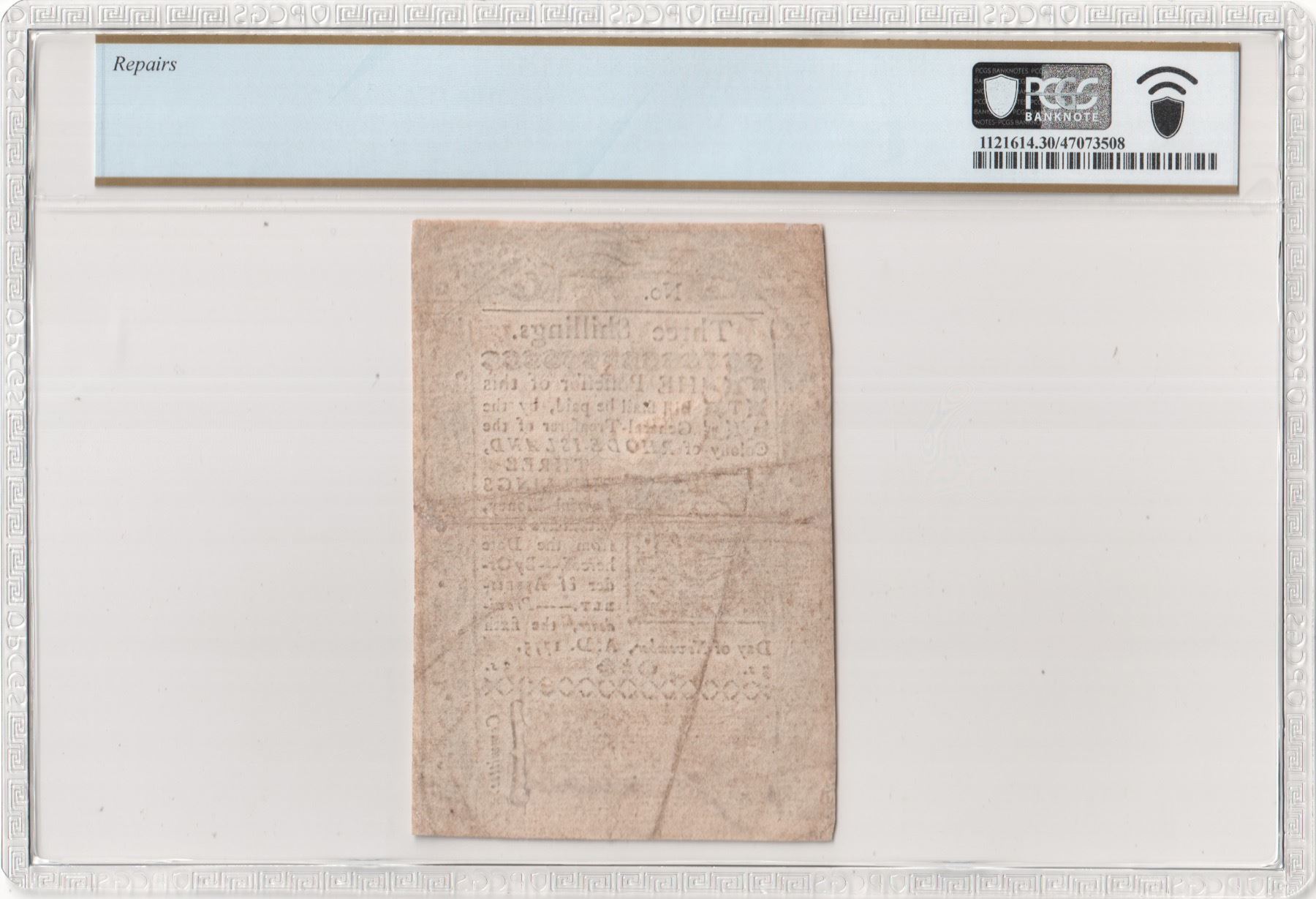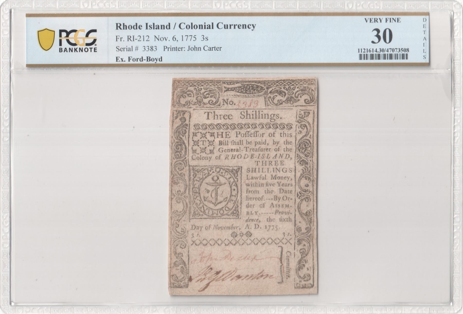 Colony of Rhode Island. Providence. November 6, 1775. Three Shillings. Fr. RI-212. PCGS Very Fine-30 Details. Repairs. As illustrated.
