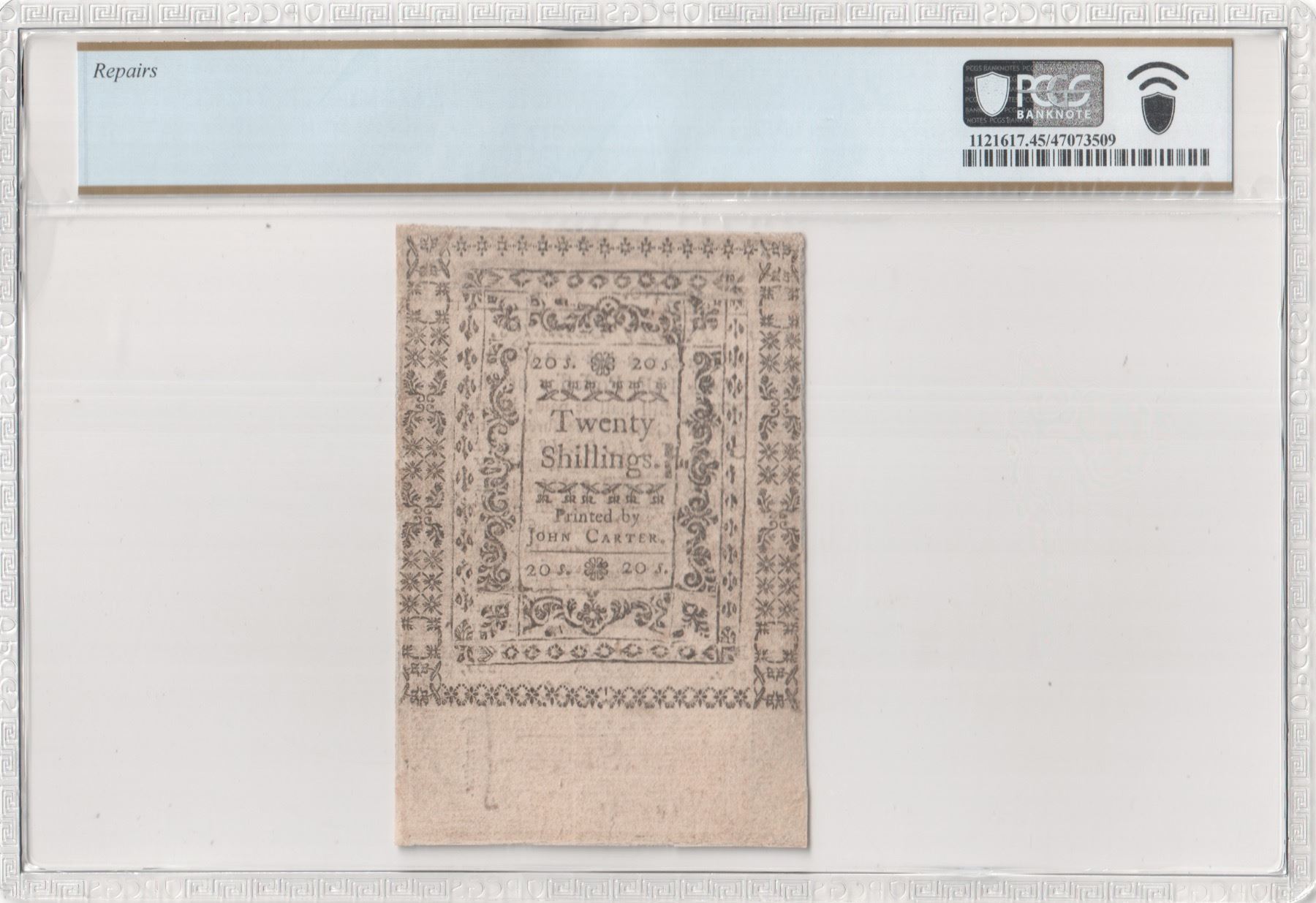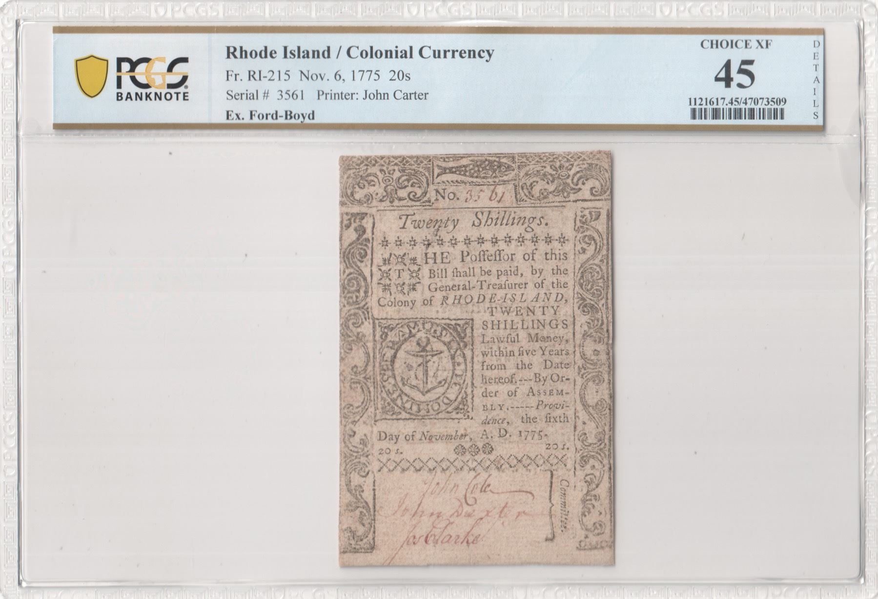 Colony of Rhode Island. Providence. November 6, 1775. Twenty Shillings. Fr. RI-215. PCGS Choice Extremely Fine-45 Details. Repairs. As illustrated.