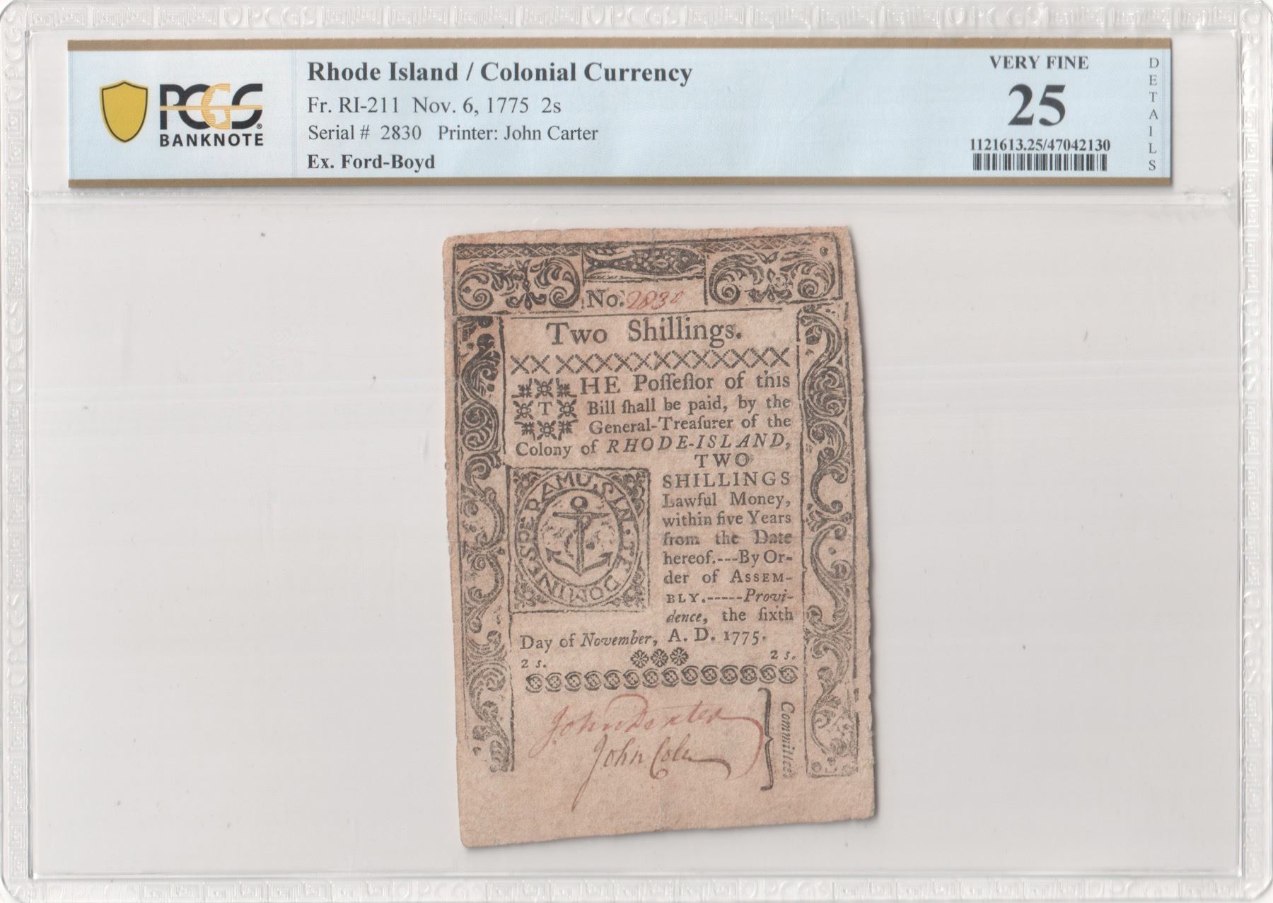 Colony of Rhode Island. Providence. November 6, 1775. Two Shillings. Fr. RI-211. PCGS Very Fine-25 D