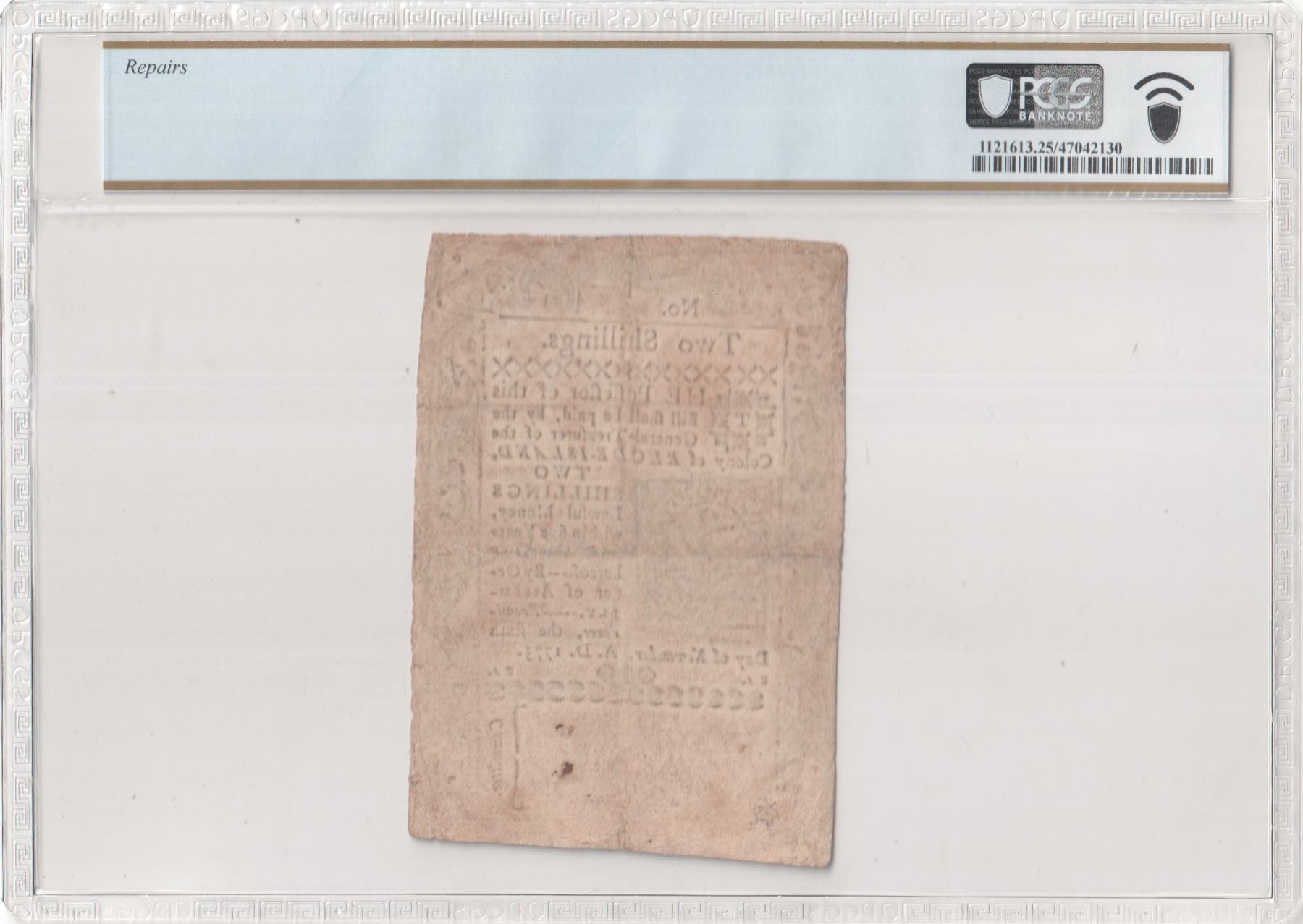 Colony of Rhode Island. Providence. November 6, 1775. Two Shillings. Fr. RI-211. PCGS Very Fine-25 Details. Repairs. As illustrated.