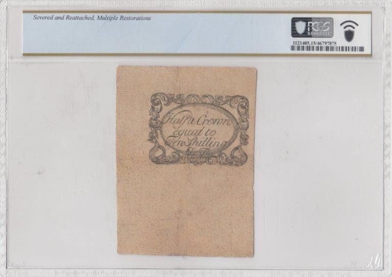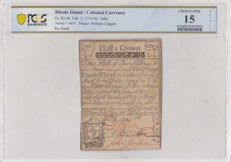 Colony of Rhode Island. South Kingstown. February 2, 1741/42. Two Shillings and Six Pence or Half A Crown (Ten Shillings O.T., Old Tenor). Fr. RI-46. PCGS Choice Fine-15 Details. Severed and Reattached, Multiple Restorations. As illustrated.
