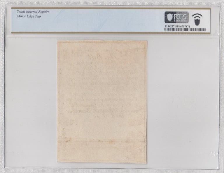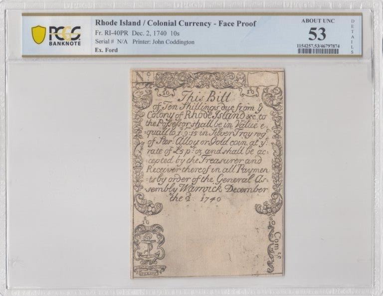 Colony of Rhode Island. Warwick. December 2, 1740. Ten Shillings. Fr. RI-40PR. PCGS About Uncirculated-53 Details. Small Internal Repairs, Minor Edge Tear. As illustrated.