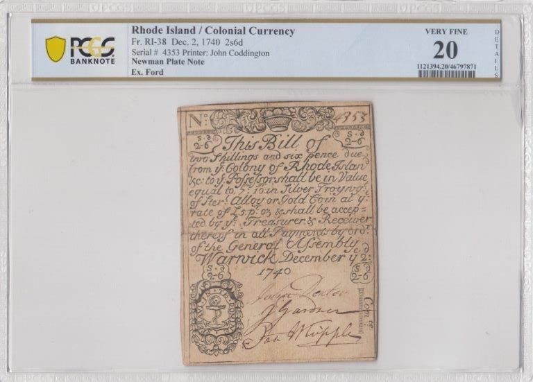 Colony of Rhode Island. Warwick. December 2, 1740. Two Shillings and Six Pence or Half A Crown. Fr. RI-38. PCGS Very Fine-20 Details. Severed and Reattached, Restorations. As illustrated.