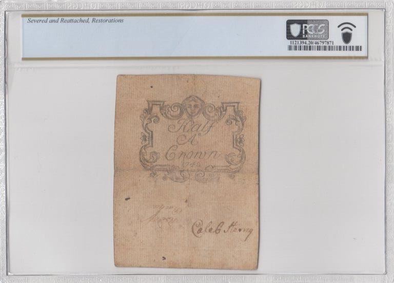Description: Laid paper. Serial No. 4353. Signed by John Dexter, J. Gardner, and Jos. Whipple. Printed by John Coddington. Two-Sided, back countersigned by Caleb Strong and another not quite readable. 80mm by 105mm. To get right to the chase on this rare note, we quote the Ford writer: “A very rare series, and this note is undeniably genuine in our, Mr. Ford’s, and Mr. Newman’s opinions.” You cannot get a better stamp of approval than that in the colonial note field. The ink is still bold on the face, though a trifle faded on the back. The Newman Plate note. An aesthetically appealing “two and six” that has fared well from careful curatorial discipline. Far finer in-hand than the PCGS qualifiers suggest. The cosmetic touch-ups have preserved the integrity of this rarity for future generations, all without hiding or masking the original flaws. A superb note in all regards. This note was one of the most avidly pursued lots in Part III of the Ford sale. Its performance there had broken the five-figure mark when the hammer finally fell. We foresee nothing that will keep this note from a similar performance this time around.