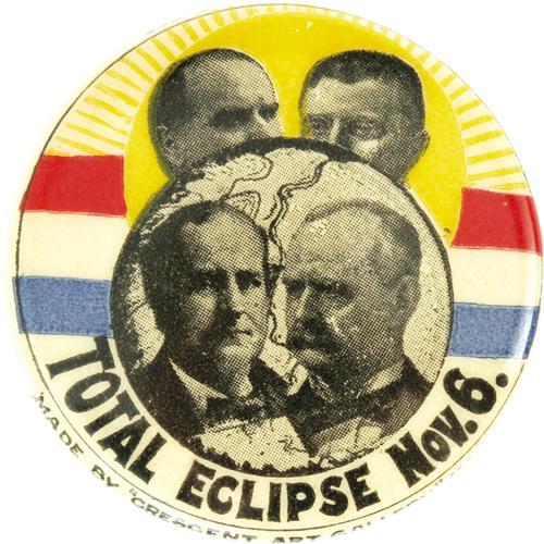 <B>Full-Color Bryan & Stevenson Jugate "Eclipse" Button, The Premier Celluloid in the Loewenstern Collection.</B></I> This eclipse theme is found on several button designs for 1900, showing one candidate "eclipsing" the other. Most are sepia-toned although there is one variety in color which shows a single Bryan image eclipsing a single portrait of McKinley. All are considered rare; the U.I. Harris specimen of the single-pictures color eclipse was sold for a record $11,700 in 2000 by Slater's Americana. <BR><BR>Fewer than five examples of this 1 1/4" jugate version are known and this is the first we have ever handled. The record price is probably a confirmed private sale also in 2000, at $20,000. The present copy is in choice condition, and will satisfy the most demanding collector or investor. A rare opportunity to acquire one of the truly legendary celluloid button rarities. <I>From the Norman Loewenstern Collection.</B></I>