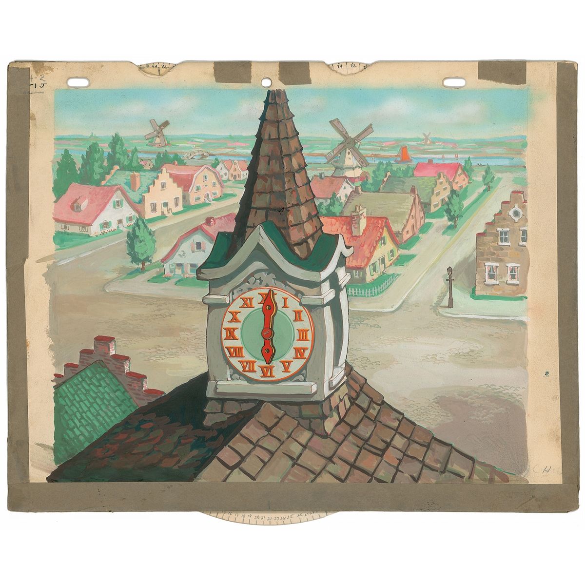 (Fleischer Studios, 1934) Original Color Classics production background from Little Dutch Mill featuring a meticulously hand-painted view overlooking a Dutch town from a clock tower. Accomplished in gouache on a 12 x 9.5 sheet of illustration board. In fine condition. This innovative ‘mechanical’ background was designed so that the hands of the clock and blades of the windmills are separate cutouts that could be rotated via hand-turned wheels on the reverse. Little Dutch Mill was just the second color cartoon that Fleischer ever produced. This piece has been selected for inclusion in The Dawn of Technicolor, to be published in 2015 by George Eastman House.