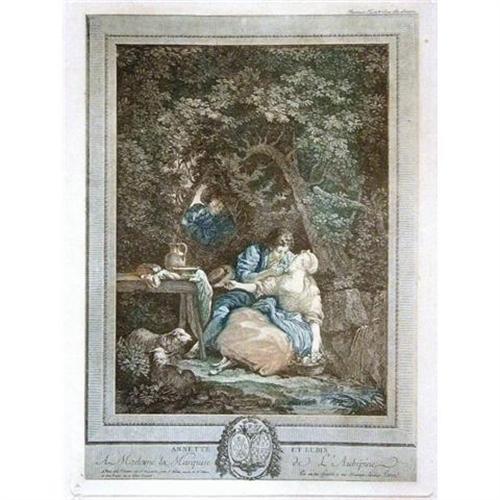 Charming color engraving entitled "Annette et Lubin" after the 18th Century comic opera of the same name. The text on the page reads as follows: Raphael Tuck & Sons Ltd. London. Annette et Lubin A Madame la Marquise de L'Aubepine. A Paris chez l'auteur rue St. Hyacinthe, porte St. Mund, maison de Mr. Debure et ches Bason rue et Hotel Serpente. Grave dápres le tableau par P. A. Boudouin. Par son tres humble et tres obeissant serveur Ponce. It also has a tiny logo embossed on the lower left. One of a pair listed separately. In good used condition with minor signs of wear as shown. Please ask questions, request additional photos and shipping costs before buying.