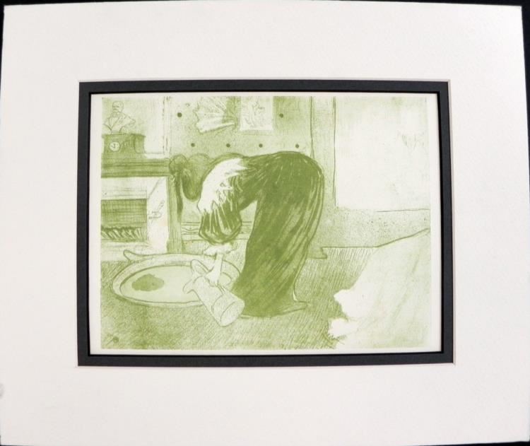 Artist: Henri de Toulouse Lautrec Medium: Gravures "hors texte" (Engraving)Matte: Double mattedImage size: 7 1/2" x 5 1/2"Matte size: 12" x 10"Justification du Tirage (Justification of Drawing): Affixed to the back of the foam-core backingCondition: Very good**Justification du triage: At the beginning or at the end of a volume, it is the indication given by the editor of a print edition, specifying the different types of copies published and paper used.BiographyHenri de Toulous-Lautrec (1864-1904) debt to the Impressionists, in particular the more figurative painters Manet and Degas, is apparent. His style was influenced by the classical Japanese woodprints which became popular in art circles in Paris. In his works can be seen parallels to Manet's detached barmaid at A Bar at the Folies-Bergère and the behind-the-scenes ballet dancers of Degas. He excelled at capturing people in their working environment, with the colour and the movement of the gaudy night-life present but the glamour stripped away. He was masterly at capturing crowd scenes in which the figures are highly individualized. At the time that they were painted, the individual figures in his larger paintings could be identified by silhouette alone, and the names of many of these characters have been recorded. His treatment of his subject matter, whether as portraits, scenes of Parisian night-life, or intimate studies, has been described as both sympathetic and dispassionate. Toulouse-Lautrec's skilled depiction of people relied on his painterly style which is highly linear and gives great emphasis to contour. He often applied the paint in long, thin brushstrokes which would often leave much of the board on which they are painted showing through. Many of his works may best be described as drawings in coloured paint.