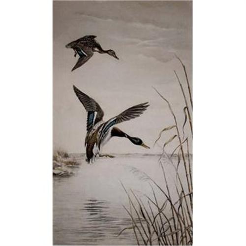 Beautiful color lithograph of ducks (mallards) in flight over a pond signed on the lower right: Leon Danchin and numbered 301/500. The text: Copyright by La Gravure Francaise 41 Rue St Georges - Paris is printed on the upper left border of the image (partly illegible). Danchin (1887-1939) was a French School artist born in Lille. From his early childhood he was attracted to drawing and hunting. He studied at L'Ecole des Beaux Art in Paris and was accepted by the Salon des Artists at the early age of sixteen. His interest developed towards country and hunting scenes. His engravings and lithographs were immediately successful in the art world. He served as a soldier during the Great War and, upon his return to civilian life, went back to hunting and studying animals. Leon Danchin died at the beginning of the Second World War in Bergues, where he is buried. Danchin is listed in Benezit. In good used condition, mounted on board as shown. Please ask questions, request additional photos and shipping costs before buying.
