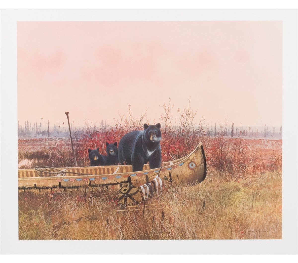 Color Michael Coleman print of black bears marauding a fishing camp, approx. 21” x 25” unframed; a playful scene created by one of America’s foremost living wildlife artists. Est.: $50-$75.