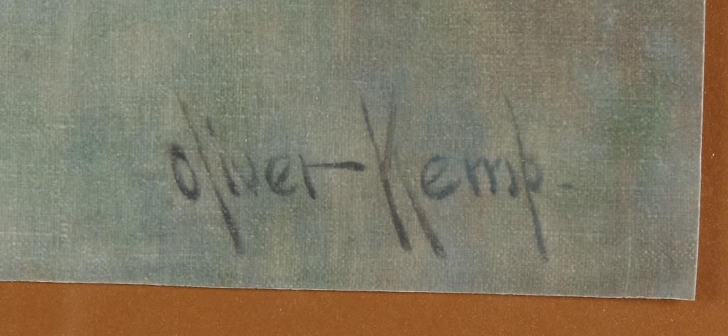 By Oliver Kemp, image size approx 11"x24", matted and in old crinkle glass wood frame.
