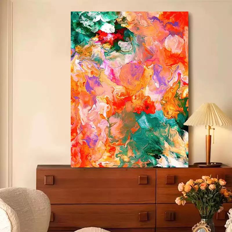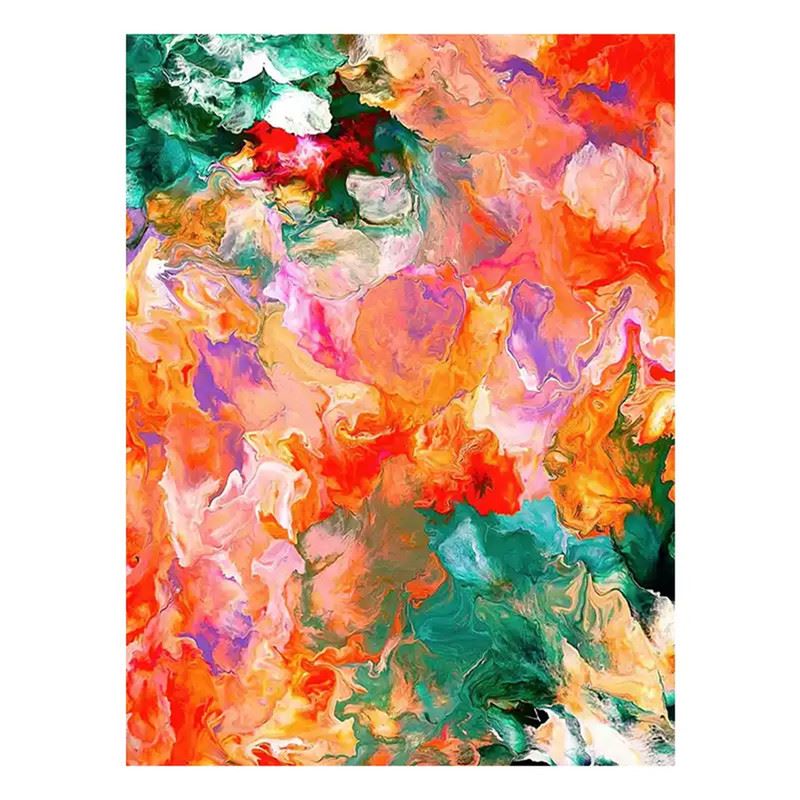 Fiery oranges and cool greens curl and collide like waves of color, surging restlessly across the canvas. Dimensions: 24 x 31 inches.