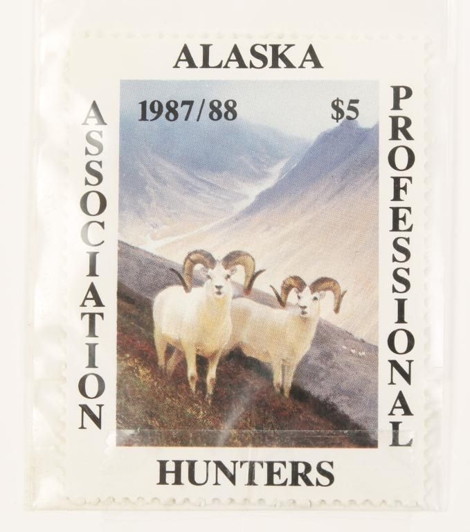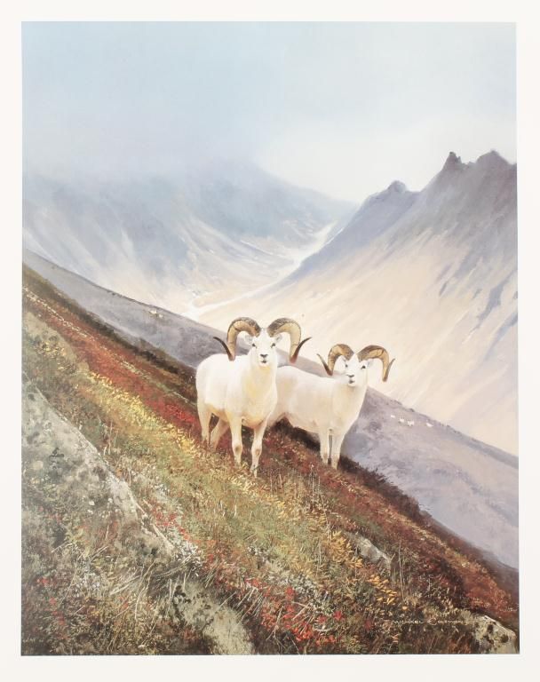 Color print entitled “Old Timers” showing two white curled horn rams in a mountain setting by Michael Coleman, approx. 18-1/2” x 14-1/2”, beautifully accomplished and accompanied by an Alaska ProfessionalHunter’s Association 1987/88 Commemorative Stamp featuring this exact scene. Coleman is one of America’s best known wildlife and Western artists and has won many awards in his field and is widely collected. Est.:$50-$100.