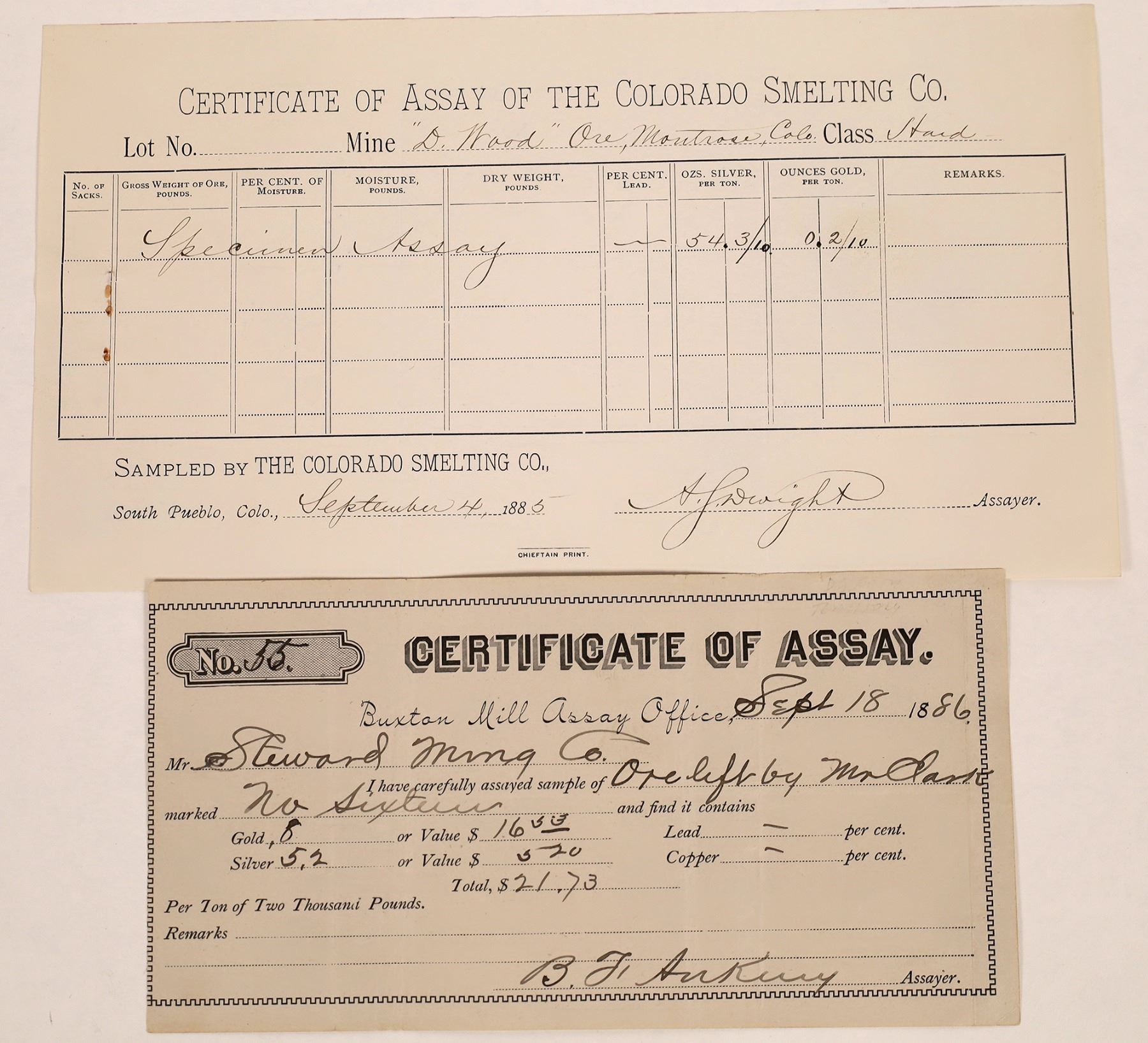 Lot of two different receipts from scarce Colorado assayers. 1) Colorado Smelting Company. South Pueblo, Colorado. Assayer A. Wright, For the D. Wood Ore, Montrose, Colo. Specimen assay of silver worth $54.30 per ton with negligible gold. 1885. 5.25" x 9.5" 2) Certificate of Assay from the Buxton Mill Assay Office. For the Steward Mining Company. Value gold $16.53 and silver $5.20. Signed by BF Aukery(?). 4 x 7.5" The Buxton Mine was in Clear Creek County near Silver Plume.