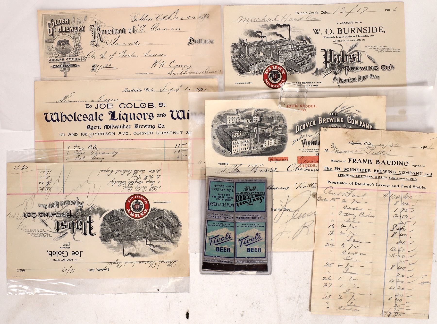 Mostly billheads regarding brewing companies in colorado. Includes Leadville 1901; Golden 1890; Denver c1925; Aquilar 1904; Creed 1894; Cripple Creek 1906; Leadville 1902. Some of th emajor brewing companies include Milwaukee Brewing, Tivoli Beer, Adolph Coors, Pabst. Ron Reed Collection