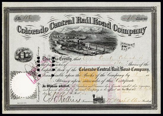 Colorado, 1873, 10 Shares, Issued, punch and ink cancelled, black border with ornate vignette of train passing wagon train with mountains in the background. IR RN-T4, 25 Cents, orange with eagle revenue. Certificate # 118. Signed by Henry Moore Teller as President. Teller served in the Senate and Cabinet for over thirty years, and was connected with the Free Silver question, beginning in 1880. Rare and popular Colorado railroad with Imprinted revenue and autograph of notable. VF condition.