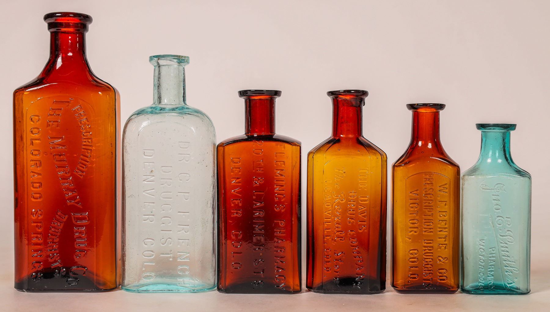 Six different Colorado colored drugstore bottles. Every advanced American drugstore bottle collector looks for those rare western colored drug bottles. There really are not many- some of the western states, such as Arizona, Nevada and New Mexico only have a handful - combined!