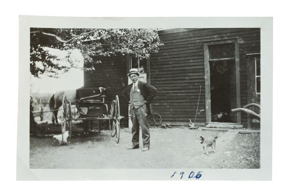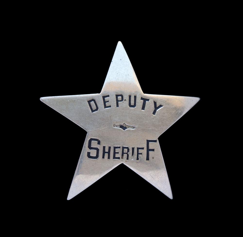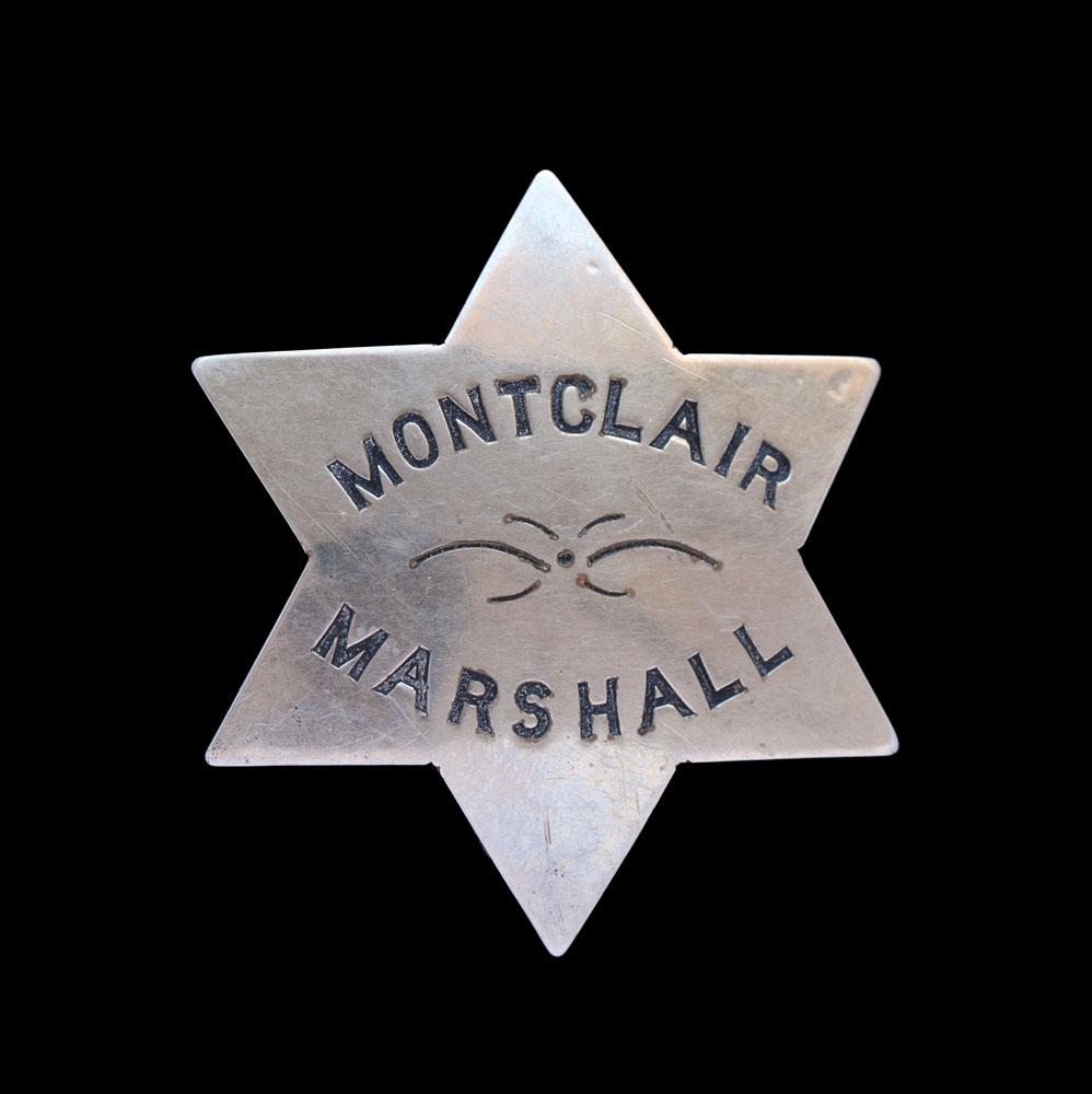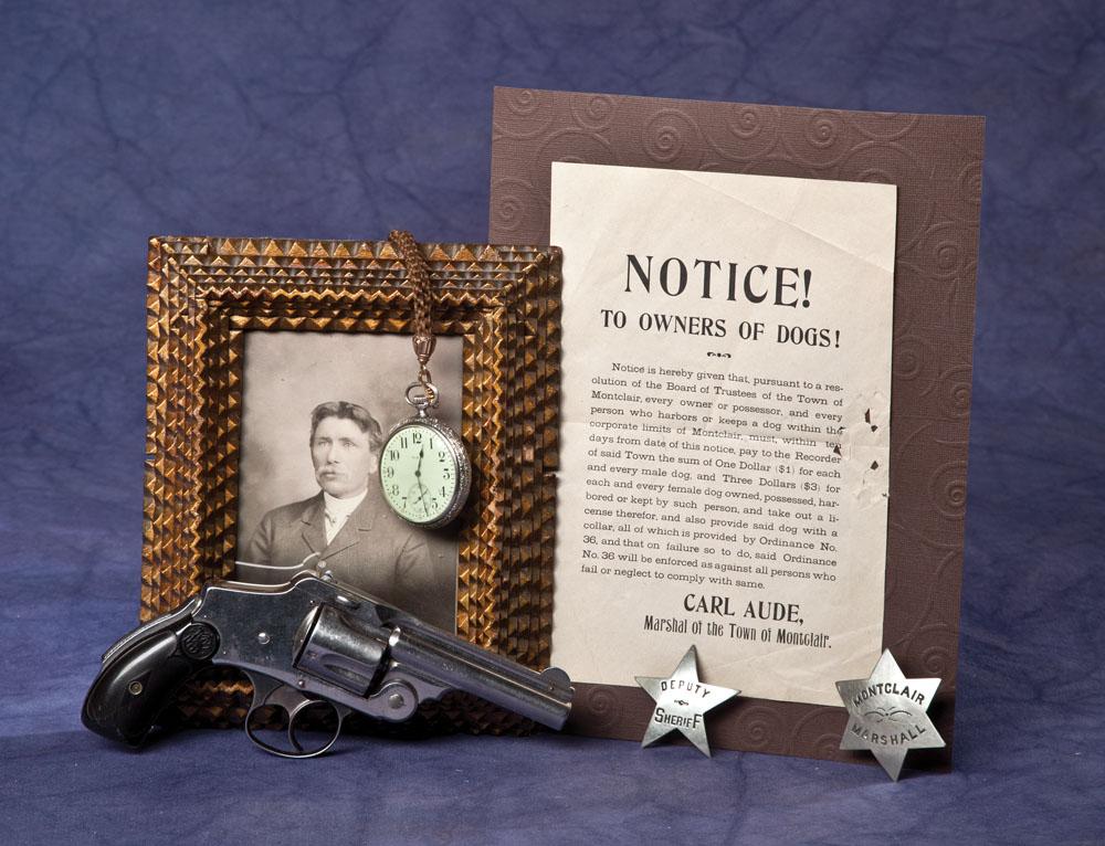 Montclair, Colorado Marshall and Deputy Sheriff. a) 6 point star badge “Montclair Marshall”; b) 5 point star badge “Deputy Sheriff”; c) Elgin pocket watch with human hair braided chain with fob; d) Notice - To Owners of Dogs! poster, 9” x 6”; e) Smith & Wesson .38 Safety First Model D.A. Revolver c. 1887. Serial # 405 , nickel, 3 1/4” barrel, hard rubber grips. 80% finish remains. In its original leather holster; f) Photos of Aude, one unmounted image of Carl wearing the Marshall badge, a mounted portrait in tramp art style frame. Other images of Carl and family. Includes copies of old city documents relating to Aude. Now a neighborhood in the City of Denver, Montclair was a small town in the eastern part of the city, that had sprouted from the shadows of the castle built by Baron Walter Von Richthofen. Carl Aude later worked at this historic Denver landmark. Provenance: From great-granddaughter of Aude, includes letter.