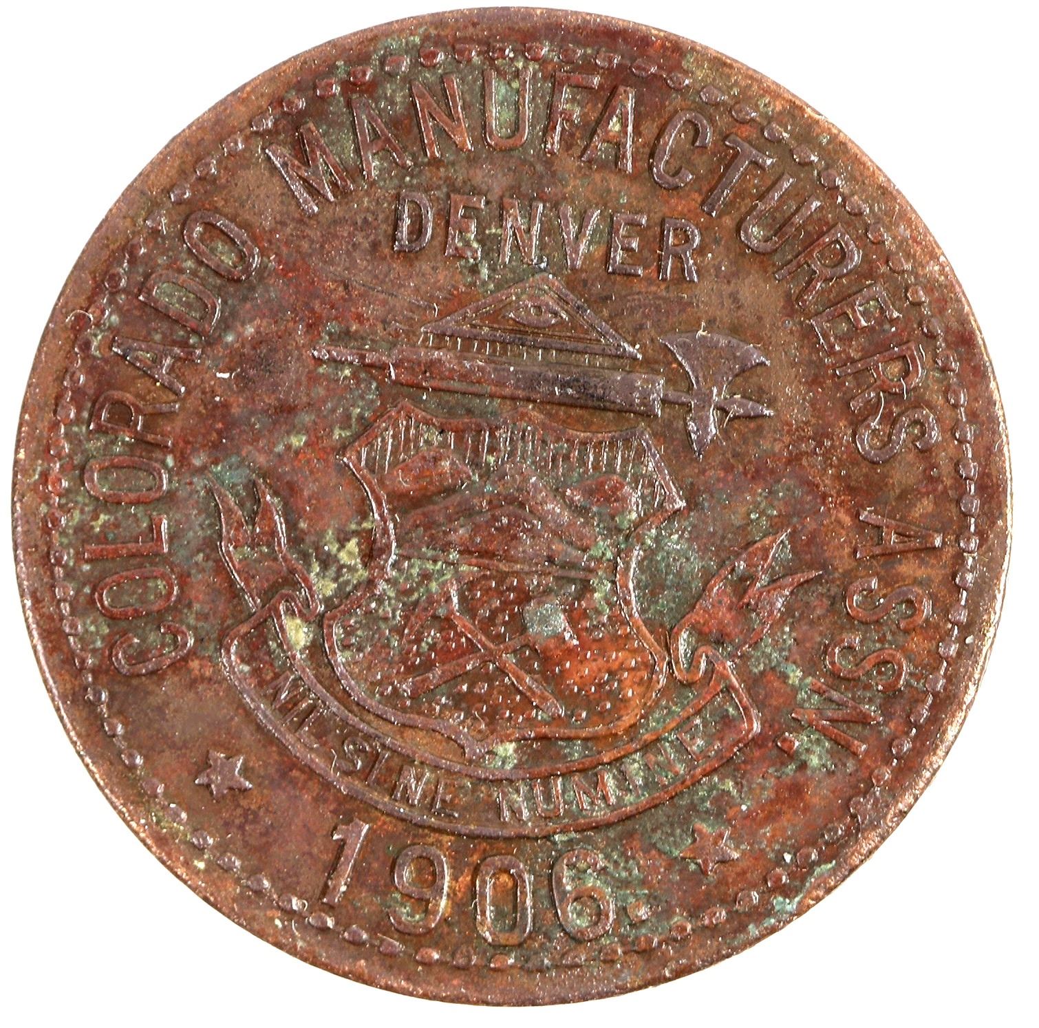 COLORADO MANUFACTURERS ASSN. / DENVER / (State Seal) / 1906. // COMPLIMENTS OF DENVER MANUFACTURERS AND MERCHANTS / KEEP / YOUR / MONEY / IN / COLORADO; Br; rd., 30 mm.