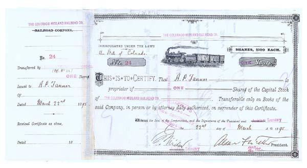 Incorporated in 1883, The Colorado Midland Railroad was the first standard gauge railroad built over the Continental Divide. The line ran from Colorado Springs to Leadville and through the divide at Hagerman Pass to Aspen and Grand Junction, Colorado. In September of 1890, the line was acquired by the AT & SF. 1895, Colorado. Stock certificate for one share. Black / White. Vignette of a locomotive at top center. Blind embossed company seal. Punch and stamp cancelled.
