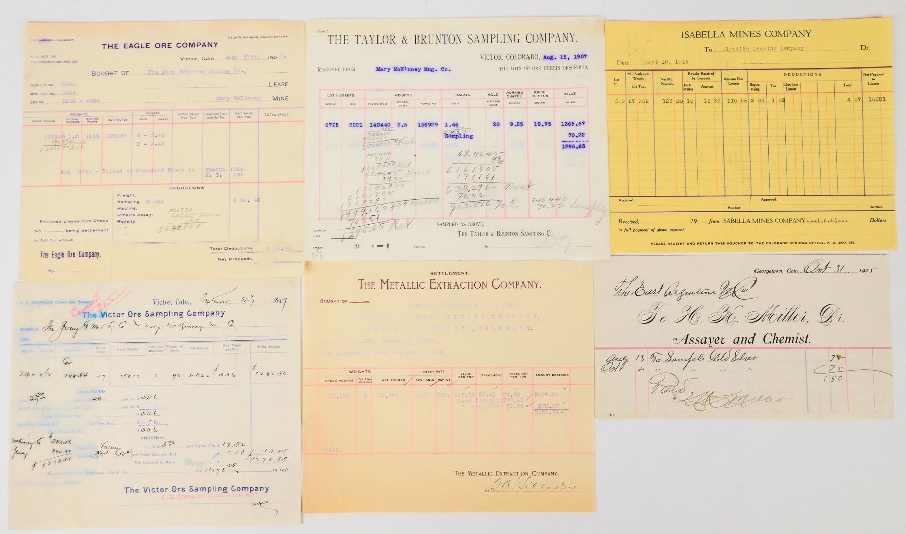 Lot of 6 different. Includes: HK Miller, Assayer & Chemist, billhead, Georgetown, 1905; Metallic Extraction Co., Cyanide, Colorado (ghost town), 1900, for Mary McKinney MC in Cripple Creek; Eagle Ore Co., Victor, 1907; Victor Ore Sampling Co., Victor, 1897; Taylor & Brunton Sampling Co., Victor, 1907; and Isabella Mines Co., Cripple Creek, 1916. Excellent group!