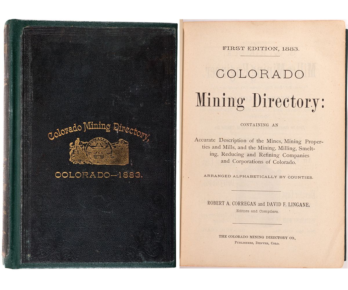 1883 1883. This is arguably one of the best western mining directories ever published. Compiled by Corregan and Lingane in 1883, it contains company histories of thousands of Colorado mining companies. It is an indespensible record. This over 900 page hard bound publication, is complete with print ads that give you a real sense of the era. Everything about this book seems intact, with a very strong binding, cloth cover that is slightly stained and a few dog-eared pages. All in all, it is an excellent book and reference. - HKA#66323