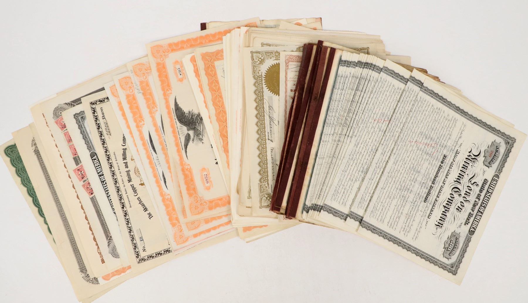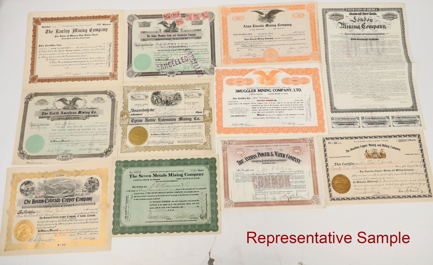 About 130 Colorado Mining Stocks/Bonds, 11 different companies including: Rocky Mountain Grain and Commission Company, Alma Lincoln Mining Company, Cyrus Noble Extension Mining Company, North American Mining Company, Boston-Colorado Copper Company, Animas Power & Water Company, Aksarben Copper Mining and Milling Company, Smuggler Mining Company, Seven Metals Mining Company, Rawley Mining Company, Mono-Baltic Mining and Smelting Company Mortgage Bonds, London Mining Company, Dexter Mining Company Gold Bond. This group mostly consists of early 1900s/pre-1920 with two later companies in the 1930s and 1960s. Stack is about yay big.