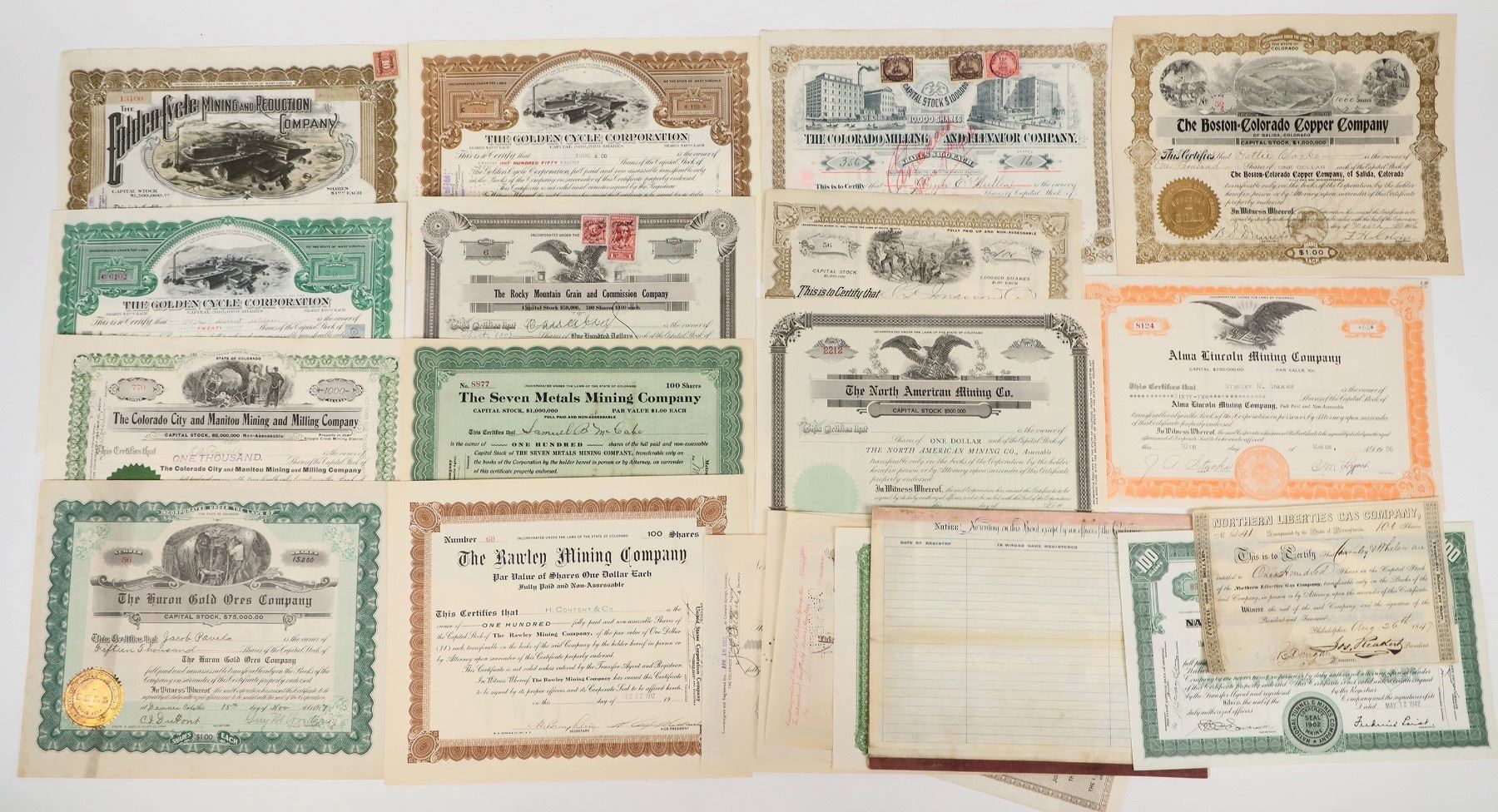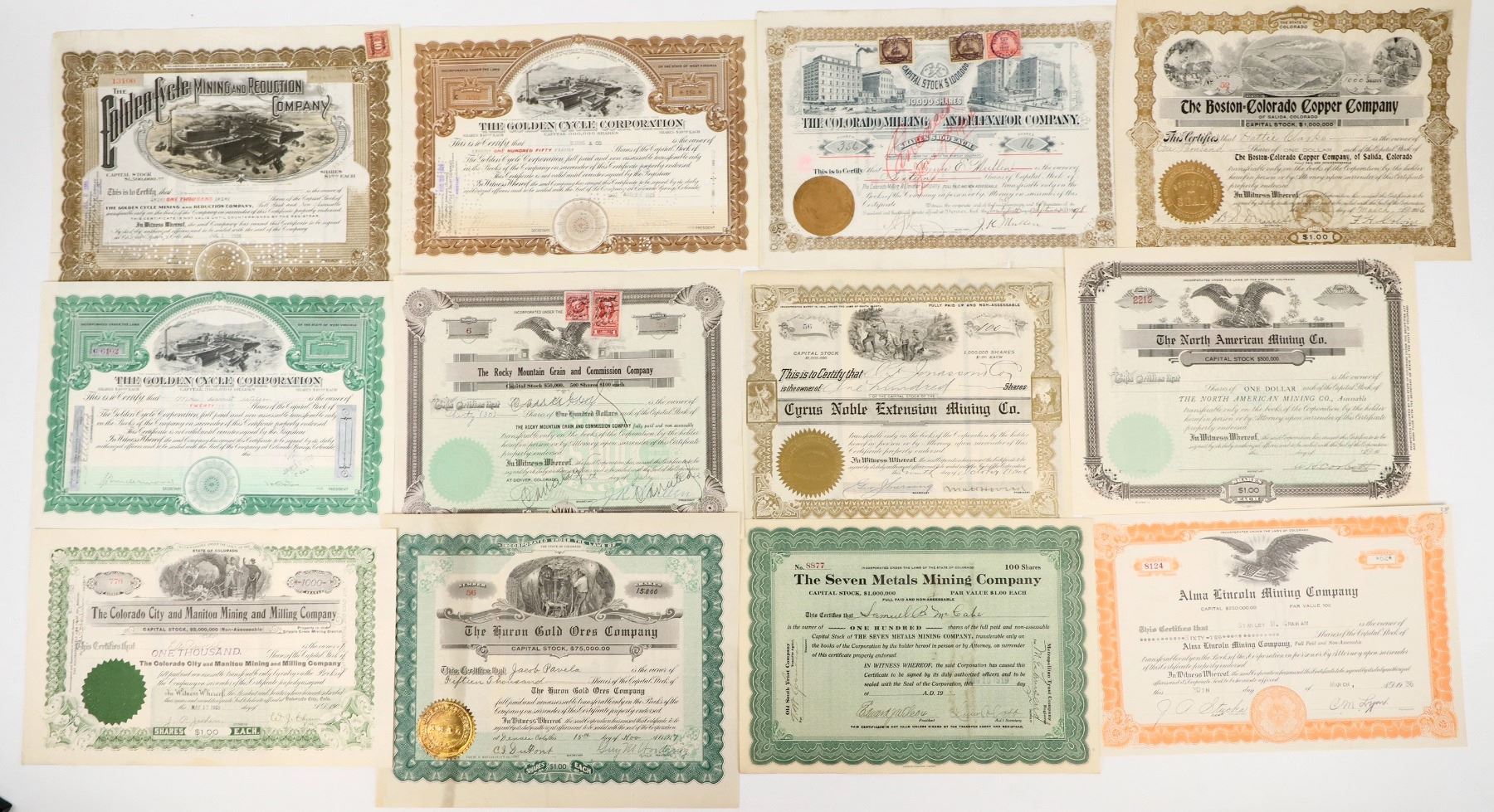 Group of 20, all appear to be different. Includes: Golden Cycle; Rocky Mountain Grain & Commission Co.; Colorado Milling & Elevator Co.; Cyrus Noble Extension MC; Tomahawk Mines Co.; Boston-Colorado Copper Co.; Empire Lee MC; Acacia GMC; Favorite GMC;Black Hawk GMC; North American MC; and more. Please inspect!
